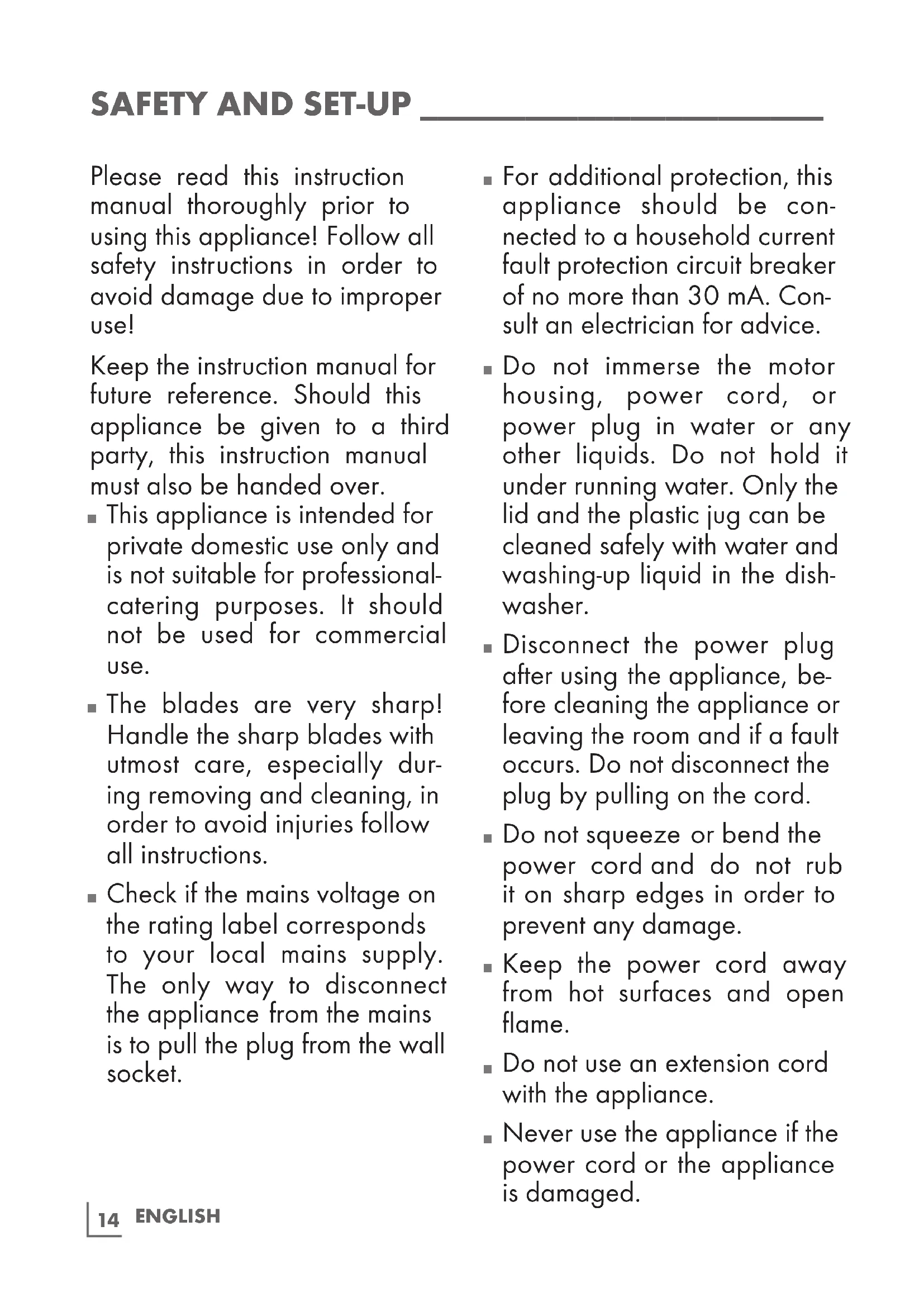 Do not immerse the motor housing, power cord, or power plug in water or any other liquids. Do not hold it under running water. Only the lid and the plastic jug can be cleaned safely with water and washing-up liquid in the dish- washer.