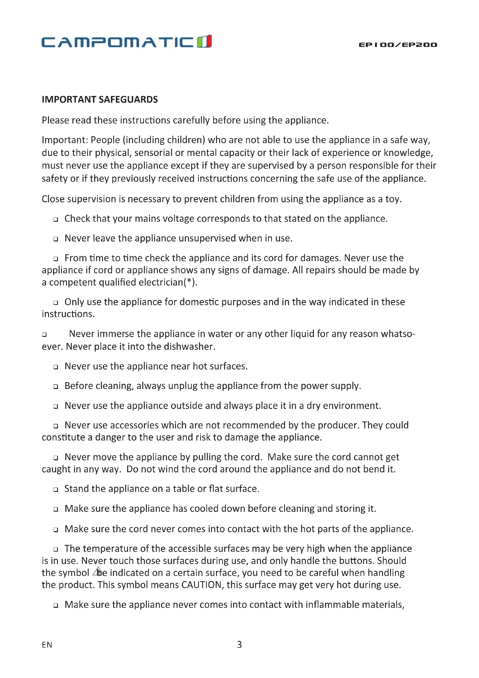 Download the instructions for your Cooker in PDF format for free! Find your manual EP200 - Campomatic and take your electronic device back in hand. On this page are published all the documents necessary for the use of your device. EP200 by Campomatic.