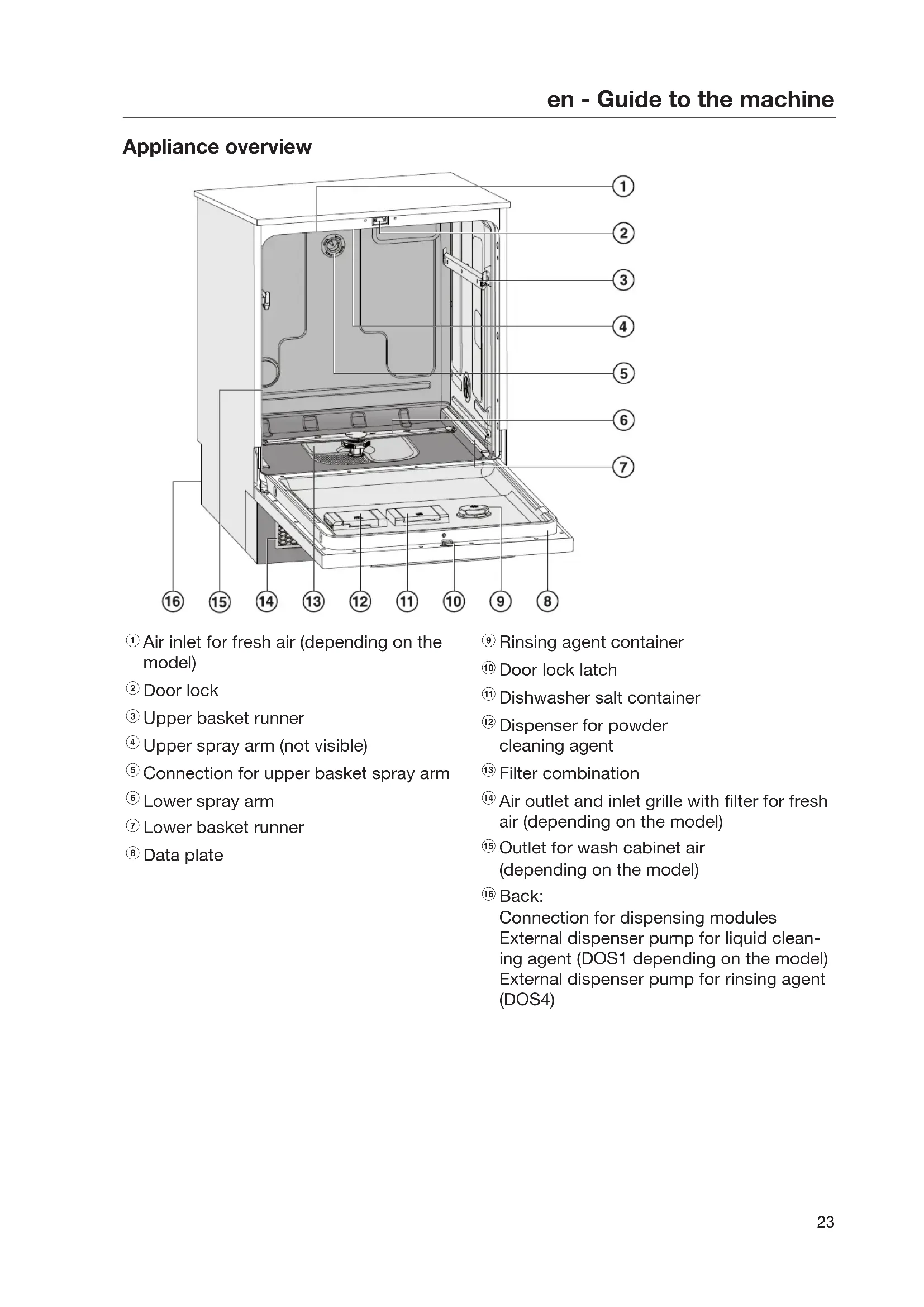 Back: Connection for dispensing modules External dispenser pump for liquid clean- ing agent (DOS1 depending on the model) External dispenser pump for rinsing agent (DOS4)en - Guide to the machine