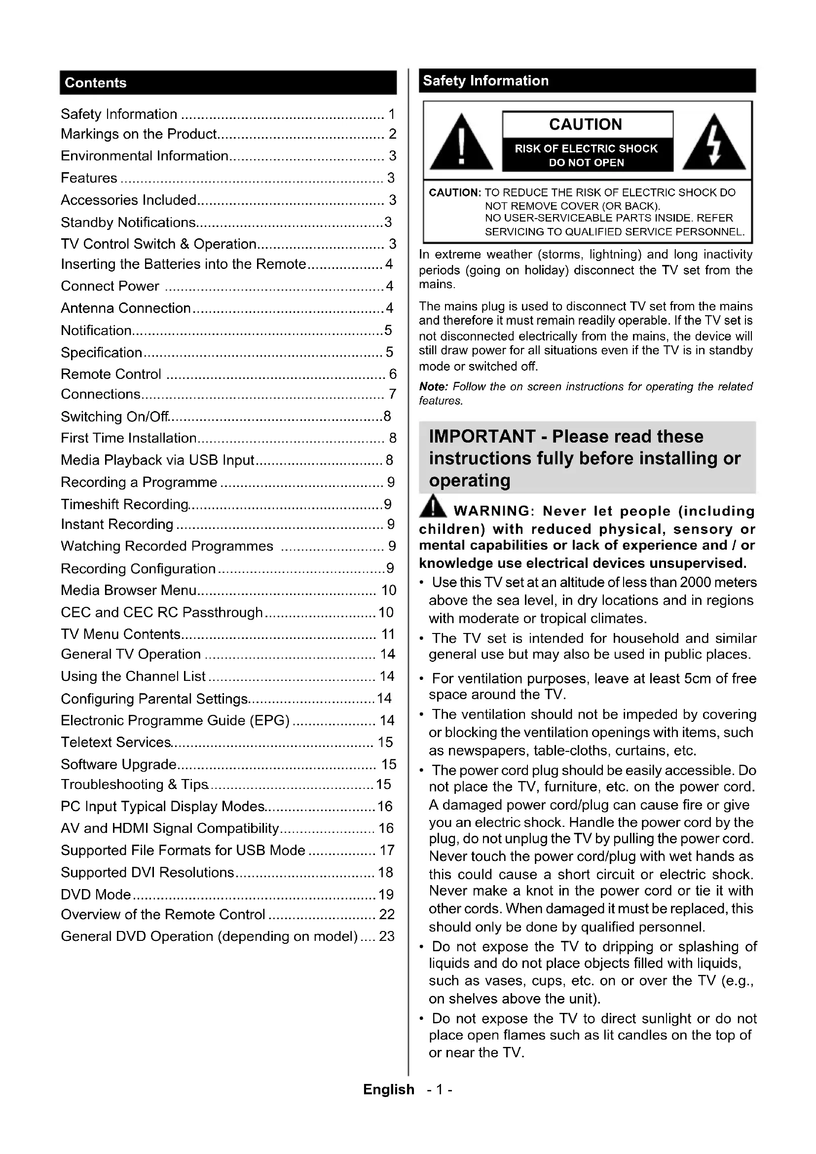 Safety Information CAUTION RISK OF ELECTRIC SHOCKDO NOT OPENCAUTION: TO REDUCE THE RISK OF ELECTRIC SHOCK DO NOT REMOVE COVER (OR BACK). NO USER-SERVICEABLE PARTS INSIDE. REFER SER VICING TO QUALIFIED SERVICE PERSONNEL. Note: Follow the on screen instructions for operating the related features. In extreme weather (storms, lightning) and long inactivity periods (going on holiday) disconnect the TV set from the mains. The mains plug is used to disconnect TV set from the mains and therefore it must remain readily operable. If the TV set is not disconnected electrically from the mains, the device will still draw power for all situations even if the TV is in standby mode or switched o. IMPORTANT - Please read these instructions fully before installing or operating