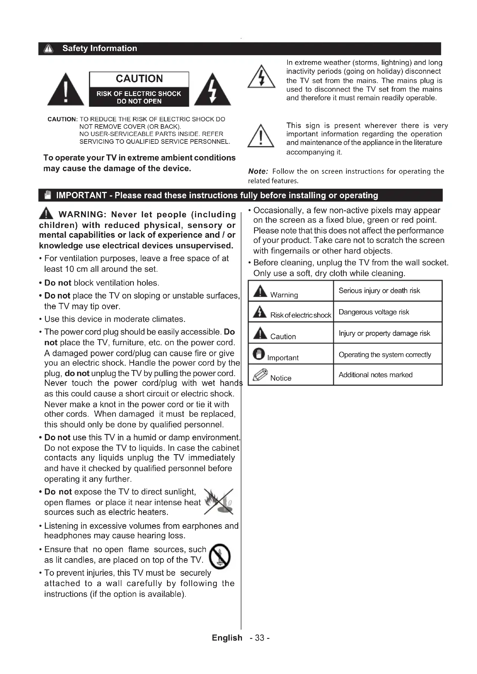 - To prevent injuries, this TV must be securely attached to a wall carefully by following the instructions (if the option is available). IMPORTANT - Please read these instructions fully before installing or operating To operate your TV in extreme ambient conditions may cause the damage of the device. CAUTION