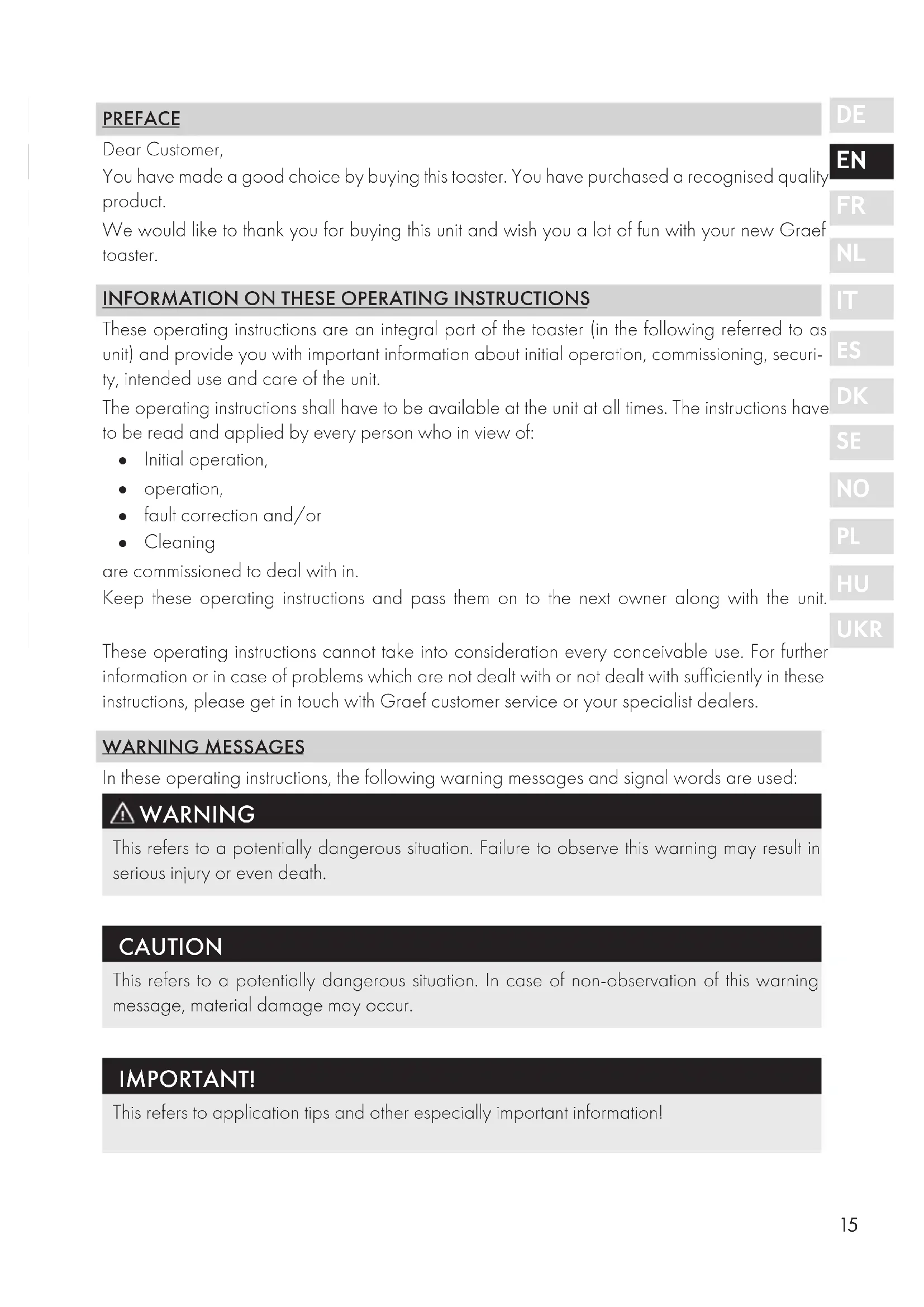 These operating instructions are an integral part of the toaster (in the following referred to as unit) and provide you with important information about initial operation, commissioning, securi- ty, intended use and care of the unit. The operating instructions shall have to be available at the unit at all times. The instructions have to be read and applied by every person who in view of: ● Initial operation, ● operation, ● fault correction and/or ● Cleaning are commissioned to deal with in. Keep these operating instructions and pass them on to the next owner along with the unit. These operating instructions cannot take into consideration every conceivable use. For further information or in case of problems which are not dealt with or not dealt with sufficiently in these instructions, please get in touch with Graef customer service or your specialist dealers. WARNING MESSAGES In these operating instructions, the following warning messages and signal words are used: WARNING This refers to a potentially dangerous situation. Failure to observe this warning may result in serious injury or even death. CAUTION This refers to a potentially dangerous situation. In case of non-observation of this warning message, material damage may occur. IMPORTANT! This refers to application tips and other especially important information!16