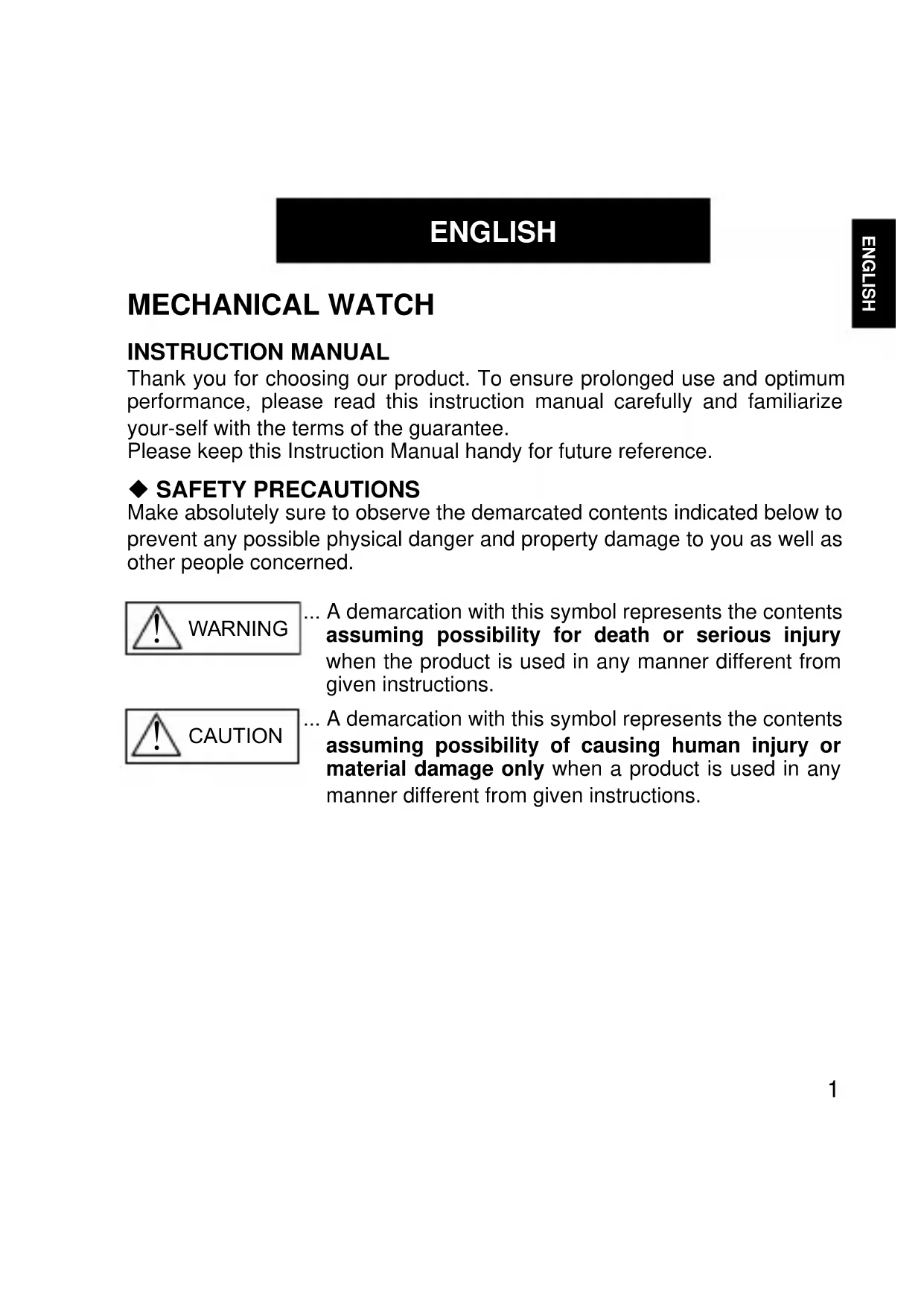 ENGLISH ENGLISH MECHANICAL WATCH INSTRUCTION MANUAL Thank you for choosing our product. To ensure prolonged use and optimum performance, please read this instruction manual carefully and familiarize your-self with the terms of the guarantee. Please keep this Instruction Manual handy for future reference. SAFETY PRECAUTIONS Make absolutely sure to observe the demarcated contents indicated below to prevent any possible physical danger and property damage to you as well as other people concerned..... A demarcation with this symbol represents the contents assuming possibility for death or serious injury when the product is used in any manner different from given instructions..... A demarcation with this symbol represents the contents assuming possibility of causing human injury or material damage only when a product is used in any manner different from given instructions. WARNING