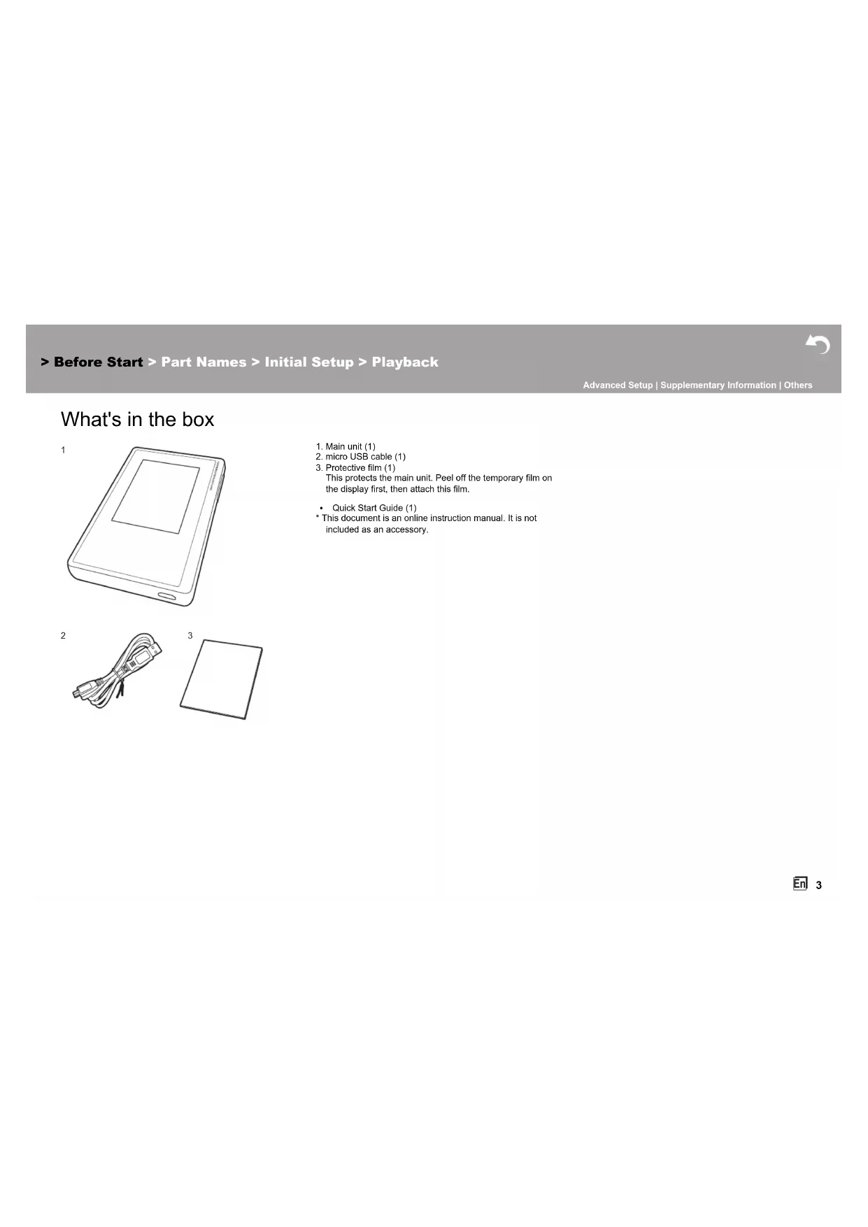 What's in the box 1. Main unit (1)2. micro USB cable (1)3. Protective film (1)This protects the main unit. Peel off the temporary film on the display first, then attach this film.0 Quick Start Guide (1)* This document is an online instruction manual. It is not included as an accessory. > Before Start > Part Names > Initial Setup > Playback Advanced Setup | Supplementary Information | Others