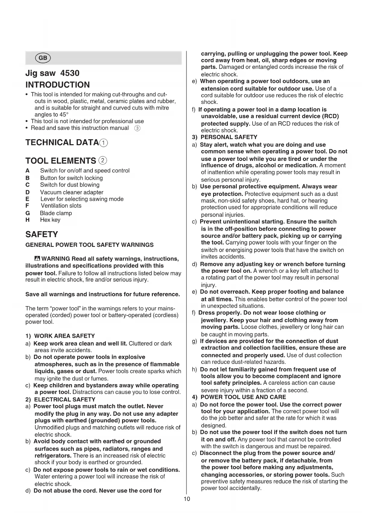 for adjusting the orbital action from accurate cutting (= 0) to fast cutting (= 3) - 1 setting (“0”) for accurate cutting in all materials, straight + curved d) Store idle power tools out of the reach of children and do not allow persons unfamiliar with the power tool or these instructions to operate the power tool. Power tools are dangerous in the hands of untrained users. e) Maintain power tools and accessories. Check for misalignment or binding of moving parts, breakage of parts and any other condition that may aect the power tool’s operation. If damaged, have the power tool repaired before use. Many accidents are caused by poorly maintained power tools. f) Keep cutting tools sharp and clean. Properly maintained cutting tools with sharp cutting edges are less likely to bind and are easier to control. g) Use the power tool, accessories and tool bits etc., in accordance with these instructions, taking into account the working conditions and the work to be performed. Use of the power tool for operations dierent from those intended could result in a hazardous situation. h) Keep handles and grasping surfaces dry, clean and free from oil and grease. Slippery handles and grasping surfaces do not allow for safe handling and control of the tool in unexpected situations.