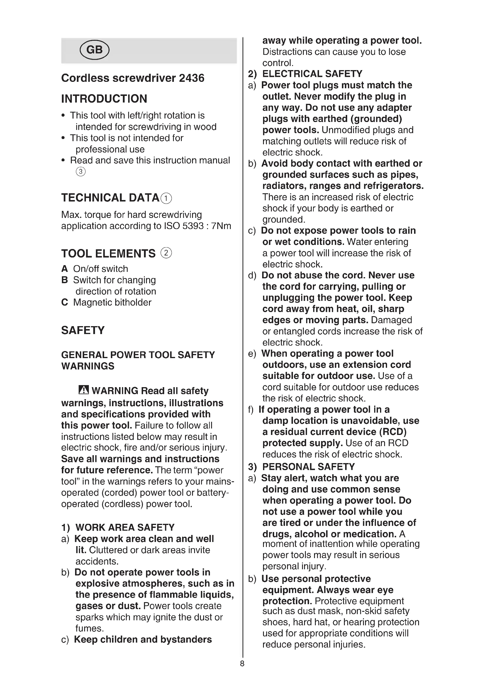 A On/o switch B Switch for changing direction of rotation C Magnetic bitholder SAFETY