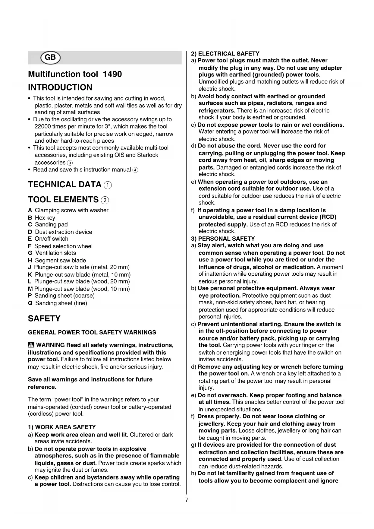 - Read and save this instruction manual 4 TECHNICAL DATA 1 TOOL ELEMENTS 2 A Clamping screw with washer B Hex key C Sanding pad D Dust extraction device E On/o switch F Speed selection wheel G Ventilation slots H Segment saw blade J Plunge-cut saw blade (metal, 20 mm) K Plunge-cut saw blade (metal, 10 mm) L Plunge-cut saw blade (wood, 20 mm) M Plunge-cut saw blade (wood, 10 mm) P Sanding sheet (coarse) Q Sanding sheet (ne) SAFETY
