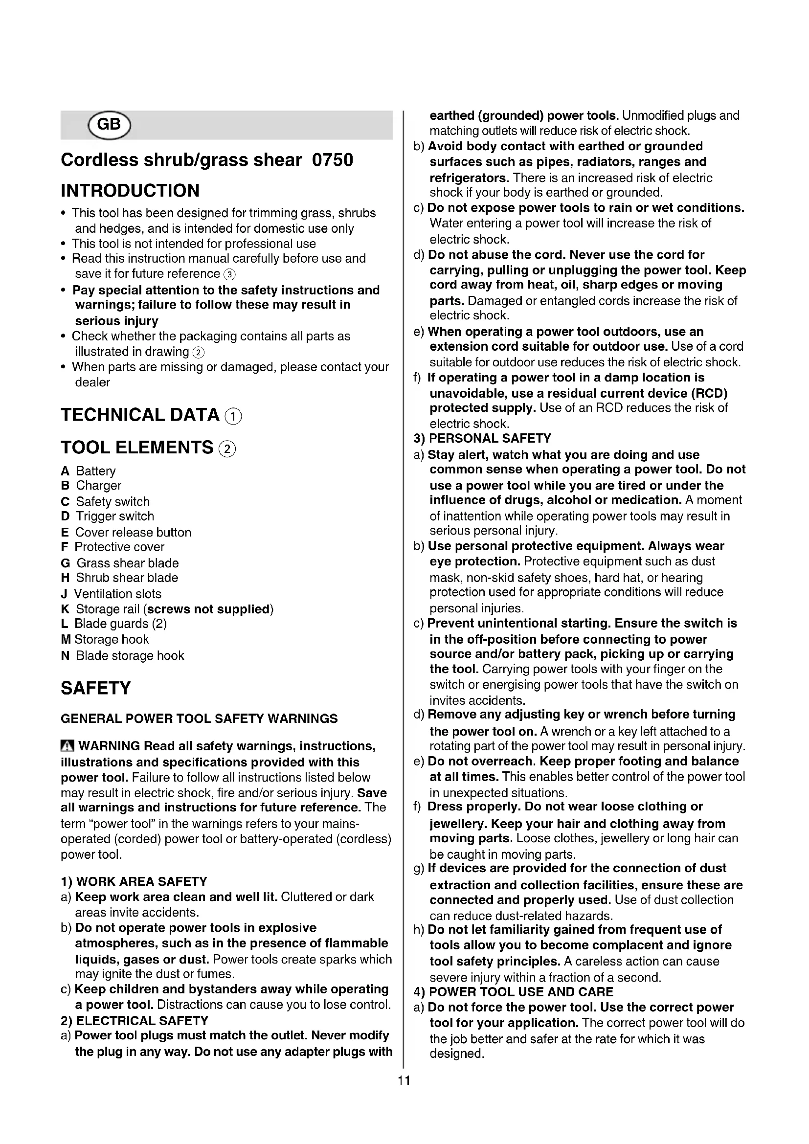 - When parts are missing or damaged, please contact your dealer TECHNICAL DATA 1 TOOL ELEMENTS 2 A Battery B Charger C Safety switch D Trigger switch E Cover release button F Protective cover G Grass shear blade H Shrub shear blade J Ventilation slots K Storage rail (screws not supplied) L Blade guards (2) M Storage hook N Blade storage hook SAFETY
