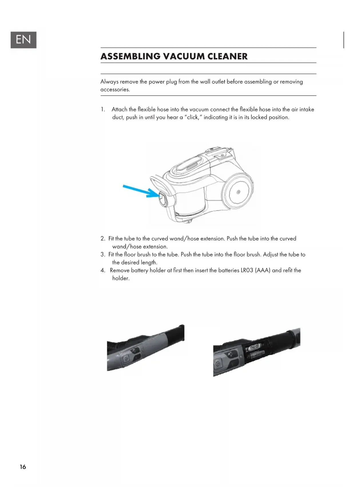 3. Fit the oor brush to the tube. Push the tube into the oor brush. Adjust the tube to