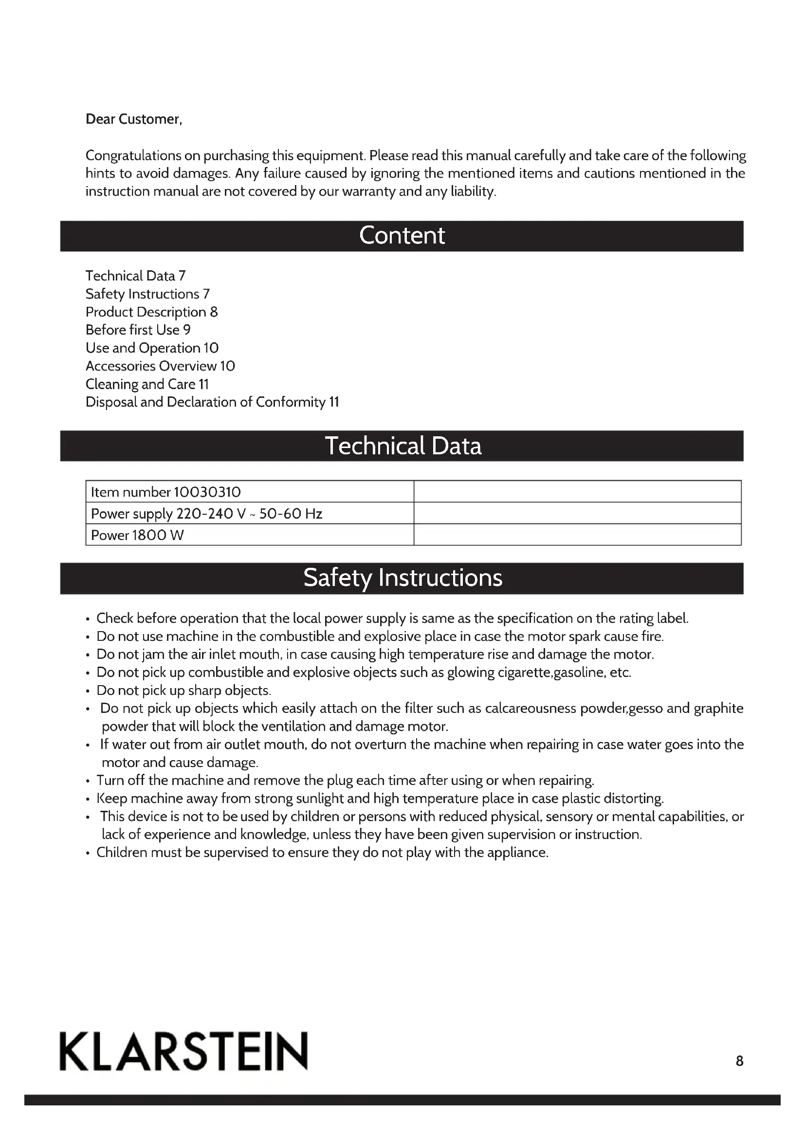Download the instructions for your Vacuum Cleaner in PDF format for free! Find your manual 10030310 - Klarstein and take your electronic device back in hand. On this page are published all the documents necessary for the use of your device. 10030310 by Klarstein.