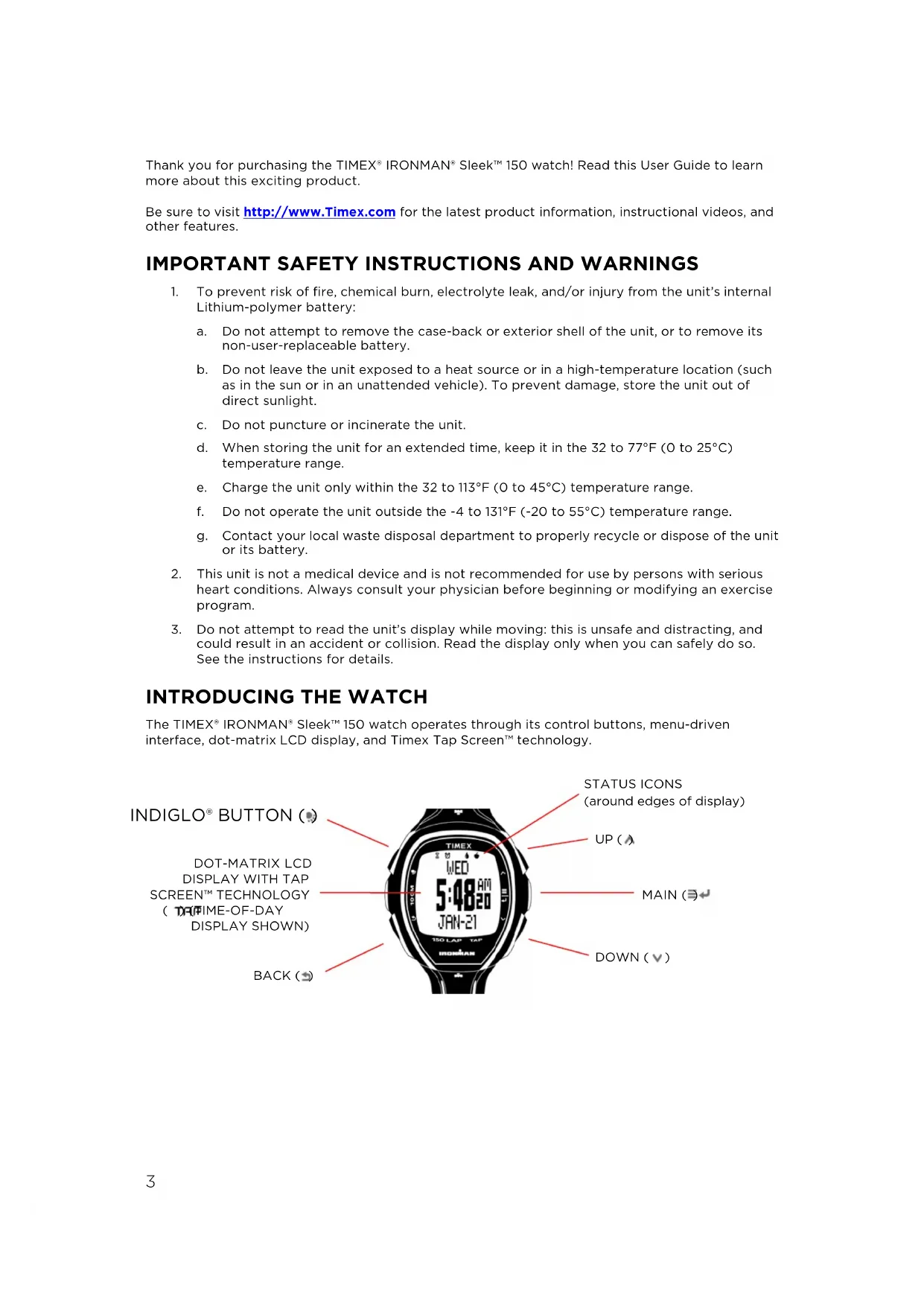 The TIMEX® IRONMAN® Sleek™ 150 watch operates through its control buttons, menu-driven interface, dot-matrix LCD display, and Timex Tap Screen™ technology.