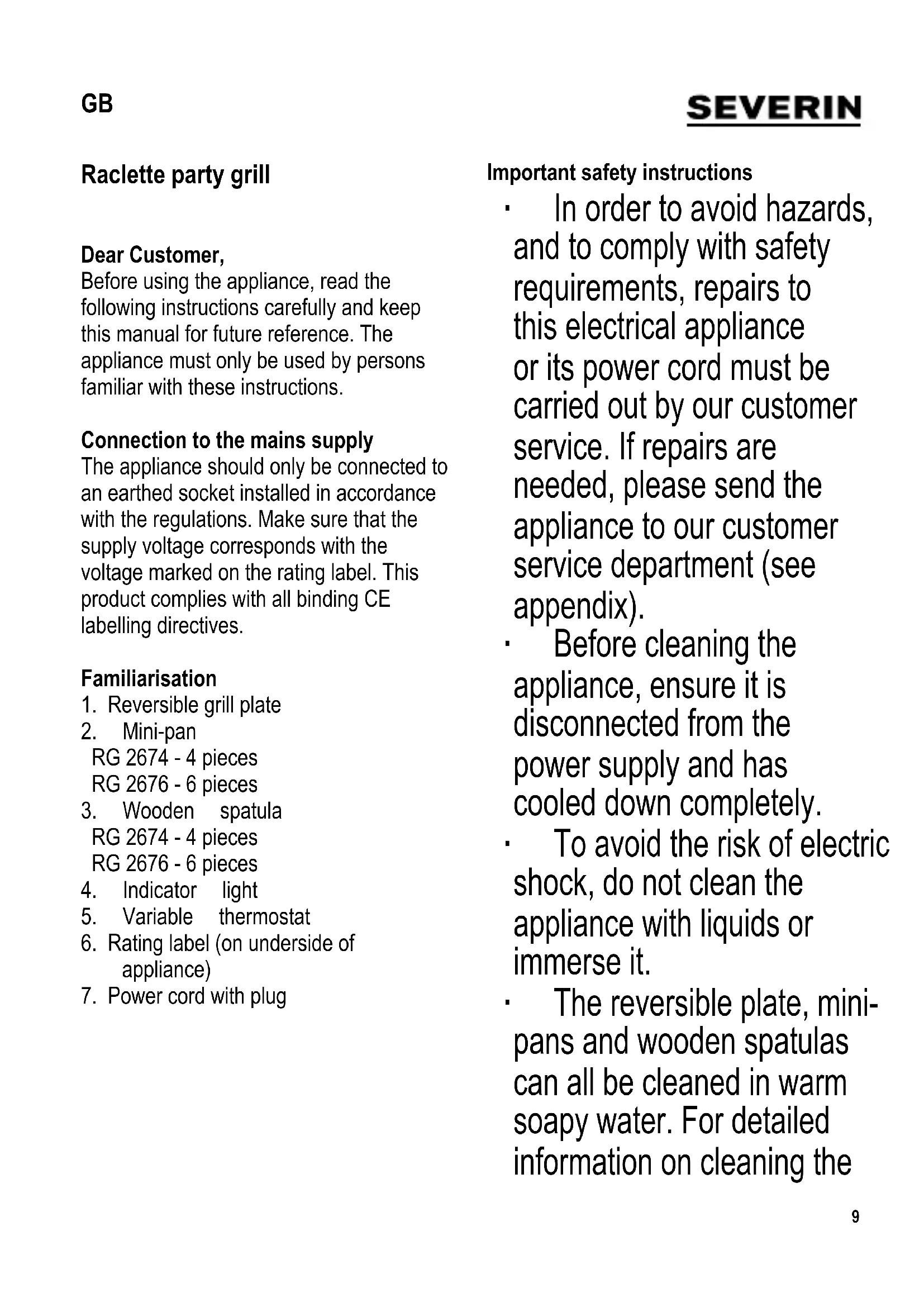 Important safety instructions ∙ In order to avoid hazards, and to comply with safety requirements, repairs to this electrical appliance or its power cord must be carried out by our customer service. If repairs are needed, please send the appliance to our customer service department (see appendix). ∙ Before cleaning the appliance, ensure it is disconnected from the power supply and has cooled down completely. ∙ To avoid the risk of electric shock, do not clean the appliance with liquids or immerse it. ∙ The reversible plate, mini- pans and wooden spatulas can all be cleaned in warm soapy water. For detailed information on cleaning the GB10 appliance, please refer to the section Cleaning and care. ∙ The appliance is not intended to be operated by means of an external timer or separate remote-control system. ∙ This appliance is intended for domestic or similar applications, such as the - staff kitchens in shops, offi ces and other similar working environments, - agricultural working environments, - by customers in hotels, motels etc. and similar accommodation, - in bed-and breakfast type environments. ∙ This appliance may only be used by children (at least 8 years of age) and by persons with reduced physical, sensory or mental capabilities, or lacking experience and knowledge, provided they have been given supervision or instruction concerning the use of the appliance and fully understand all dangers and safety precautions involved. ∙ Children must not be permitted to play with the appliance. ∙ Children must only be permitted to carry out any cleaning or maintenance work on the appliance if they are supervised and at least 8 years of age. ∙ The appliance and its power cord must be kept well away from children under 8 at all times. ∙ Caution: Keep any packaging materials well away from children – such materials are a potential source of danger, e.g. of suffocation. ∙ Before the appliance is used, the main11 body including the power cord as well as any attachment fi tted should be checked thoroughly for any faults or defects. Should the appliance, for instance, have been dropped onto a hard surface, or if excessive force has been used to pull the power cord, it must no longer be used: even invisible damage may have adverse effects on the operational safety of the appliance. ∙ Do not allow the power cord to touch any hot part of the appliance. ∙ Caution: Danger of burns. The housing surfaces, grill areas and mini-pans become hot during use and will remain so for some time afterwards. ∙ Always allow suffi cient time for the appliance to cool down before removing the grill plate, and before cleaning or storing the unit. ∙ Do not leave the appliance unattended while in use. ∙ During operation, the appliance must be placed on a heat-resistant surface, impervious to splashes and stains. When cooking food with a high fat or moisture content, splashes are not always avoidable. ∙ Do not position the grill next to a wall or corner, and ensure that no infl ammable materials are stored near it. ∙ The appliance must be operated only with the reversible grill plate correctly fi tted above the heating element. ∙ Caution: Do not operate the appliance outdoors. ∙ Always remove the plug from the wall socket - after use, - in case of any malfunction, and - before cleaning the appliance. ∙ When removing the plug from the wall socket, never pull on the power cord; always grip the plug itself. ∙ This appliance should only be used with the attachments provided by the manufacturer. ∙ No responsibility will be accepted if damage results from improper use, or if these instructions are not complied with. Before fi rst use ∙ Remove any packaging materials and stickers from the appliance completely. ∙ Before switching on the appliance for the fi rst time, wipe the reversible grill plate, wooden spatulas and mini-pans with a damp cloth. ∙ Heat the appliance and the pans for about 30 minutes, without any food in, to eliminate the smell typically encountered when fi rst switching on a grill (a small amount of smoke may also be noticeable). Adequate ventilation should be ensured by opening windows or balcony doors. ∙ Let the grill cool down again. ∙ Clean it as described in the section Cleaning and care.12 Reversible grill plate ∙ The ribbed side of the reversible grill plate is particularly suitable for doing meats, such as steak, sausages etc. ∙ The smooth side of the reversible grill plate is used for grilling vegetables and seafood. ∙ Before the appliance is switched on, position the reversible grill plate on top of the appliance over the heating element, ensuring that the recesses in the plate fi t securely onto the corresponding supports. Variable thermostat ∙ The variable thermostat controls the operating time of the heating element. For grilling or melting, turn the thermostat all the way to the right to its maximum setting. To keep food warm, turn the thermostat back to the left. ∙ The indicator light shows the operating status of the heating element. Heating element on = indicator light on Heating element off = indicator light off How to prepare raclette cheese Cut 200 to 300 grammes per person of a soft-cutting cheese into slices about 3 - 5 mm thick and put them into the mini-pans. It is preferable to use Gouda, Tilsit, Appenzell or original raclette cheese. Operation ∙ Fit the reversible grill plate as described above. Insert the plug into a suitable wall socket and turn the thermostat control all the way to the right. ∙ After a pre-heating time of about 12 minutes, the grill plate is ready for use. ∙ Place the food to be cooked on the reversible grill plate. ∙ Put the raclette ingredients into the mini- pans and place them under the heating element. Leave until the cheese has melted.