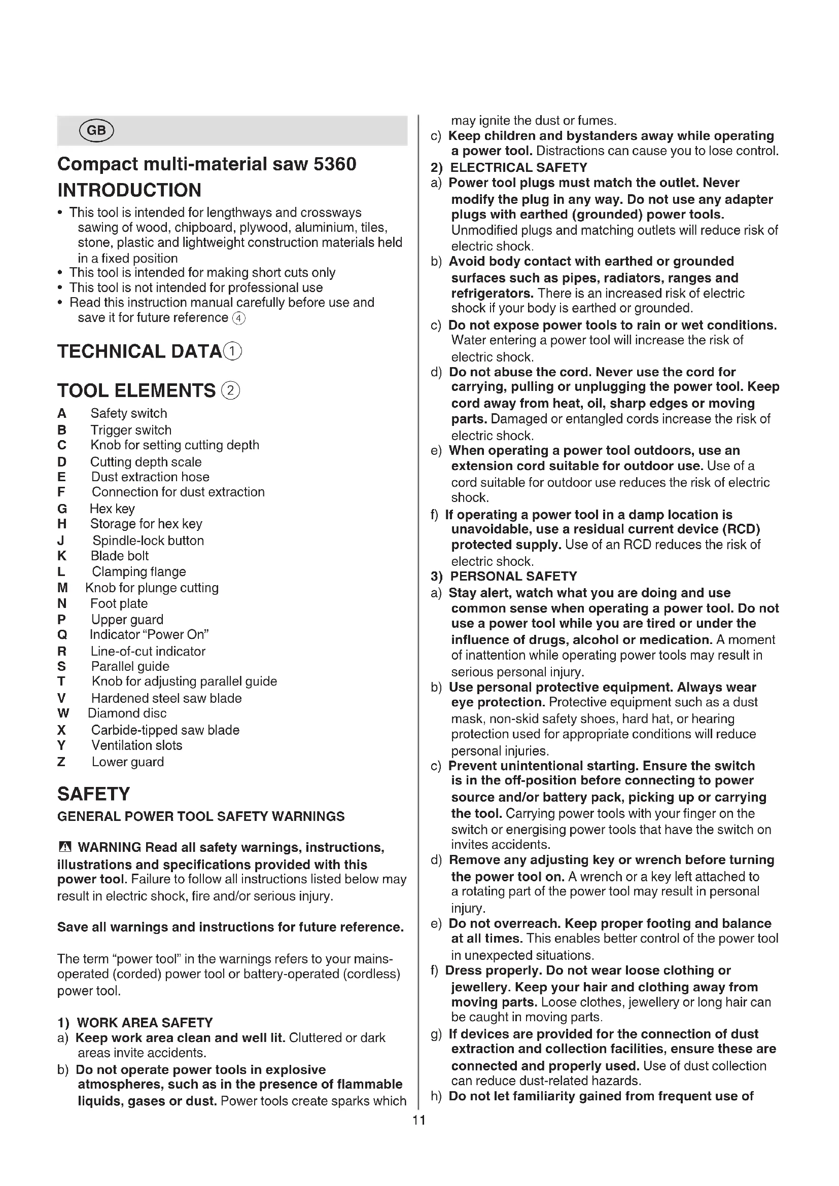 A Safety switch B Trigger switch C Knob for setting cutting depth D Cutting depth scale E Dust extraction hose F Connection for dust extraction G Hex key H Storage for hex key J Spindle-lock button K Blade bolt L Clamping ange M Knob for plunge cutting N Foot plate P Upper guard Q Indicator “Power On” R Line-of-cut indicator S Parallel guide T Knob for adjusting parallel guide V Hardened steel saw blade W Diamond disc X Carbide-tipped saw blade Y Ventilation slots Z Lower guard SAFETY