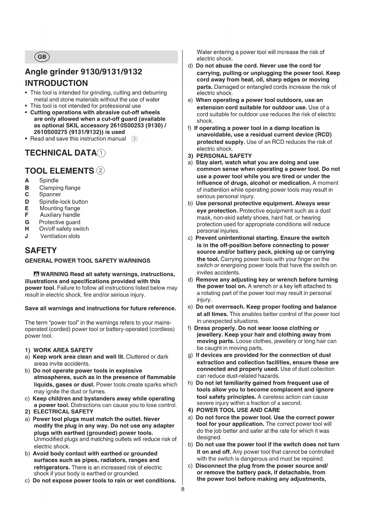 - Cutting operations with abrasive cut-o wheels are only allowed when a cut-o guard (available as optional SKIL accessory 2610S00253 (9130) / 2610S00275 (9131/9132)) is used