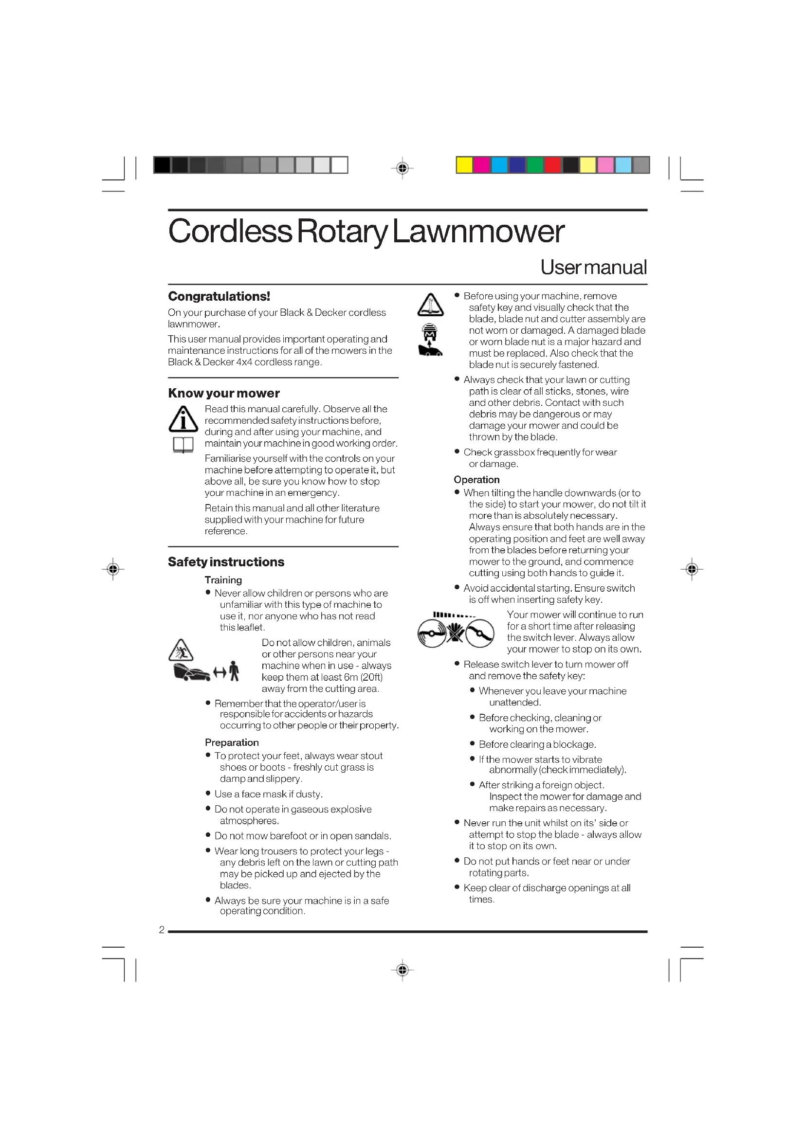 E4E3 F11 English Italiano Deutsch Français Nederlands Español Português Eλληνικά Danmark Suomi Norge Sverige2 Cordless Rotary Lawnmower Congratulations! On your purchase of your Black & Decker cordless lawnmower. This user manual provides important operating and maintenance instructions for all of the mowers in the Black & Decker 4x4 cordless range. Know your mower Read this manual carefully. Observe all the recommended safety instructions before, during and after using your machine, and maintain your machine in good working order. Familiarise yourself with the controls on your machine before attempting to operate it, but above all, be sure you know how to stop your machine in an emergency. Retain this manual and all other literature supplied with your machine for future reference. Safety instructions Training