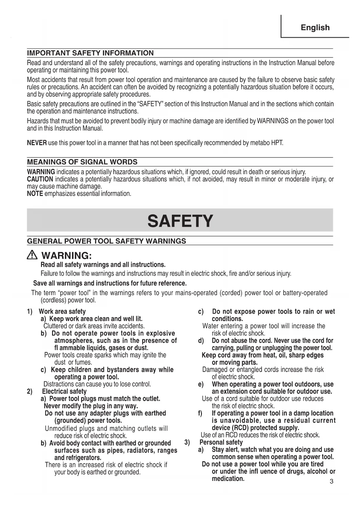 Read and understand all of the safety precautions, warnings and operating instructions in the Instruction Manual before operating or maintaining this power tool. Most accidents that result from power tool operation and maintenance are caused by the failure to observe basic safety rules or precautions. An accident can often be avoided by recognizing a potentially hazardous situation before it occurs, and by observing appropriate safety procedures. Basic safety precautions are outlined in the “SAFETY” section of this Instruction Manual and in the sections which contain the operation and maintenance instructions. Hazards that must be avoided to prevent bodily injury or machine damage are identifi ed by WARNINGS on the power tool and in this Instruction Manual. NEVER use this power tool in a manner that has not been specifi cally recommended by metabo HPT.