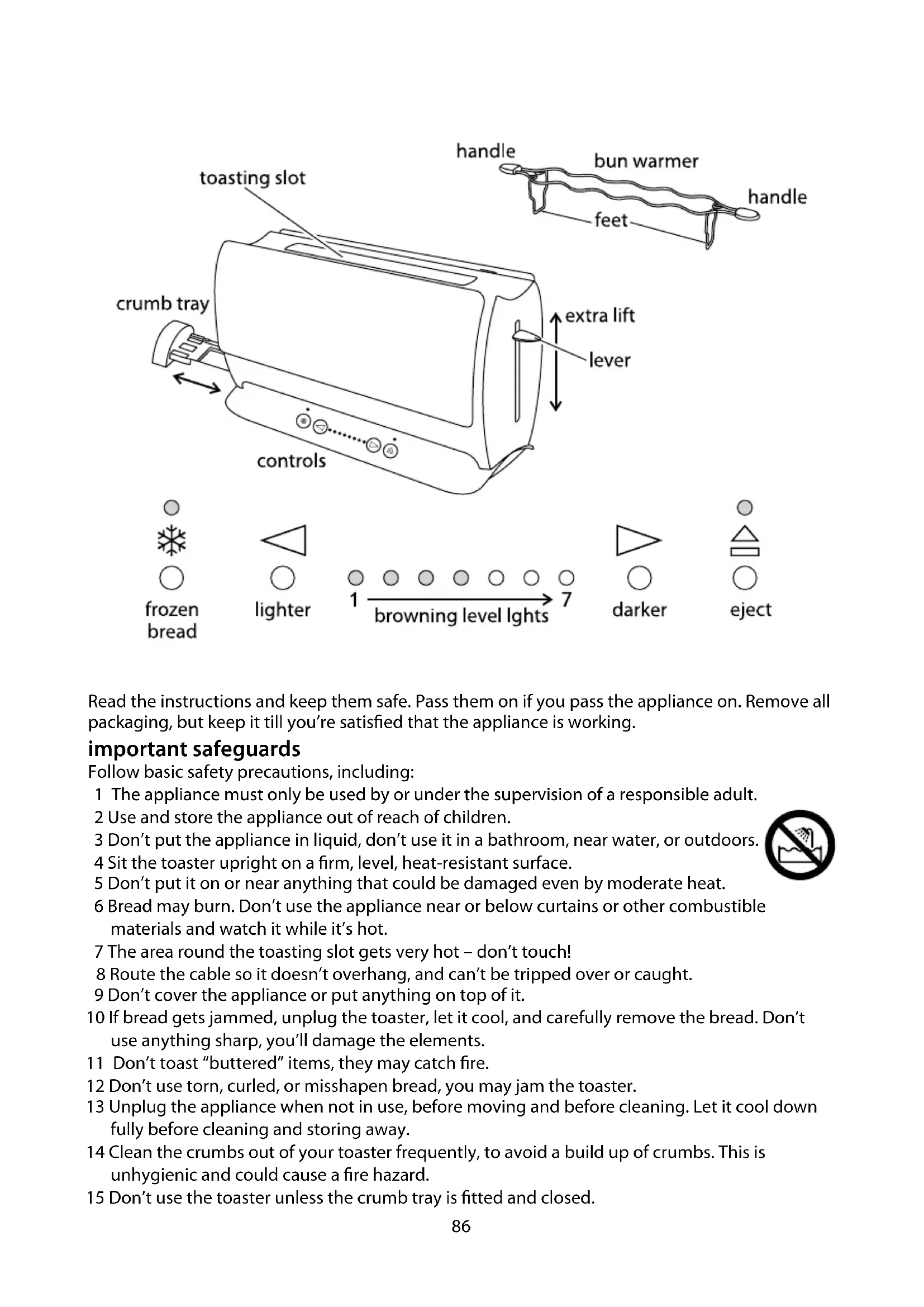 - This may smell a bit, but it’s nothing to worry about. Ensure the room is well ventilated. toasting bread 1 Sit the toaster upright on a firm, level, heat-resistant surface. 2 Don’t put it on or near anything that could be damaged even by moderate heat. 3 Bread may burn. Don’t use the appliance near or below curtains or other combustible materials and watch it while it’s hot. 4 Put the plug into the power socket. 5 The appliance will first run through a self-check routine. 6 The left four browning level lights will light up. 7 Use the buttons at either end of the browning level lights to lighten % or darken & the toast. 8 The browning level lights will come on/go off to indicate the level chosen. 9 The more lights showing, the darker the toast. 10 Put bread into the toasting slot (maximum thickness 28mm). 11 Press the lever down fully. , It won’t lock down unless the toaster is connected to the electricity supply. 12 The browning level lights will count down: a) the rightmost light will flash, the lights to its left will glow b) the rightmost light will go out, the light to its left will flash c) this will carry on till all the lights are out d) when they’re all out, the toast will pop up. eject $ 13 To stop the toaster mid-cycle, touch $. 14 The $ light will glow, the toast will pop up, then the $ light will go out. extra lift 15 After toasting small items (bagels, crumpets, etc.) the lever may be raised further, to allow them to be removed more easily. frozen bread f 16 Leave the browning control at your favoured setting, insert the frozen bread, lower the lever, then touch f. 17 The f light will come on, and the toasting time will be altered automatically to give the same degree of browning you get with unfrozen bread.88 bun warmer , Use the bun warmer only on browning level 1. 18 Don’t use the bun warmer to warm frozen, buttered, coated, iced, or filled buns. 19 Sit the bun warmer on top of the toaster, with the feet inside the slot. 20 Sit the buns on top of the bun warmer. 21 Set the browning level to 1, then lower the lever. 22 When the lever pops up, remove the warmed buns. 23 Don’t touch the bun warmer wires – they’ll be hot. 24 Remove the bun warmer before using the toaster normally. reheating toast 25 Use the lowest setting. Only reheat plain, “unbuttered” toast. hints and tips 26 If toasting more than one slice, use slices of similar size, thickness and freshness. 27 Old (yesterday’s) bread contains less moisture, so makes crisper toast 28 Old or thin bread cooks faster than fresh or thick bread. Use a lower setting 29 Sweet bread products (tea cakes, fruit loaf, etc.) brown much more quickly than ordinary bread, so should be toasted on a lighter setting care and maintenance 30 Unplug the toaster and let it cool down. 31 Wipe outer surfaces with a damp cloth. 32 Remove and empty the crumb tray. Wipe with a damp cloth, dry, then replace it in the toaster. 33 Don’t use the toaster unless the crumb tray is fitted and closed. 34 Don’t put the appliance in water or any other liquid. 35 Don’t use harsh or abrasive cleaning agents or solvents. wheelie bin symbol To avoid environmental and health problems due to hazardous substances in electrical and electronic goods, appliances marked with this symbol mustn’t be disposed of with unsorted municipal waste, but recovered, reused, or recycled. 550-530
