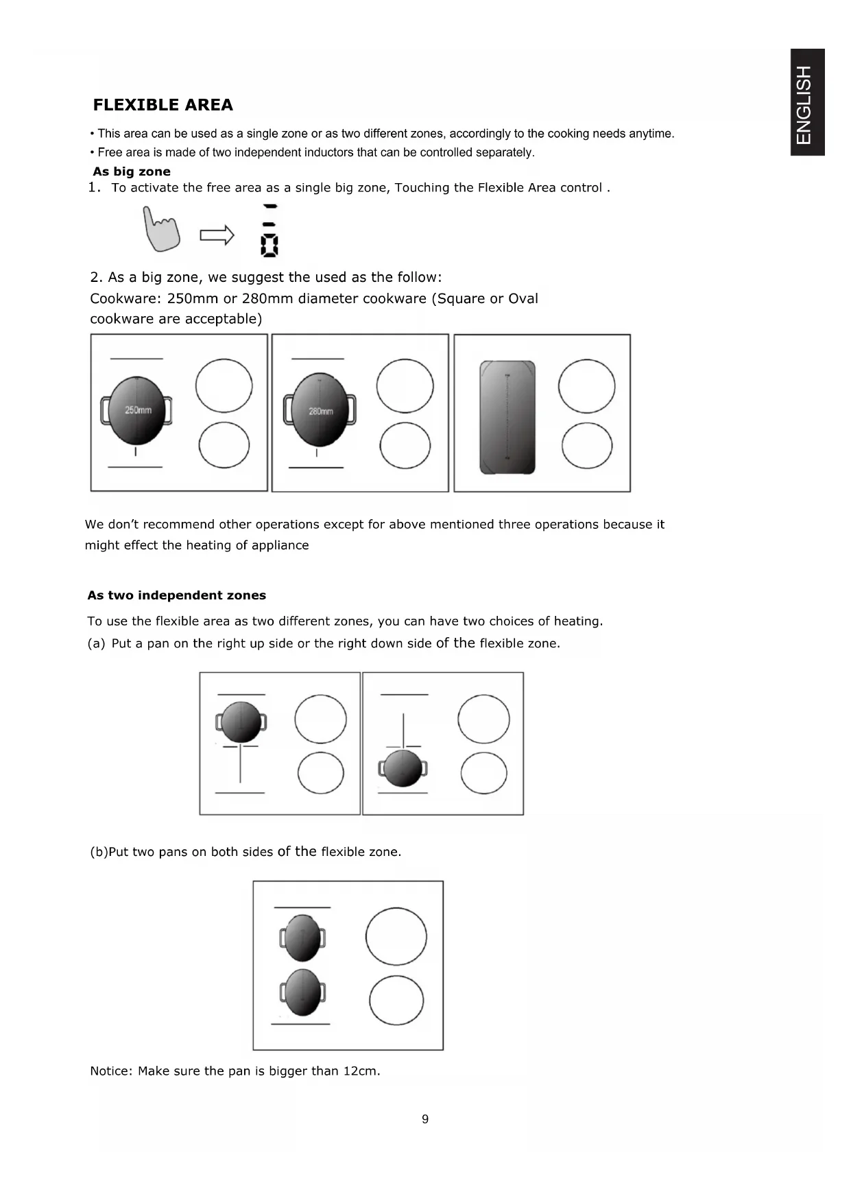 We don’t recommend other operations except for above mentioned three operations because it might effect the heating of appliance To use the flexible area as two different zones, you can have two choices of heating. (a) Put a pan on the right up side or the right down side of the flexible zone. ENGLISH 9Note: It is recommended that the cooker hood suction is switched on few minutes prior to cooking and switched off few minutes after terminating cooking. @oost mode Touching the heating zone selection control , then touching “+” 。Make sure the display shows “9”. Touching the “+” button again ,the zone indicator show “b” and the power reach Max