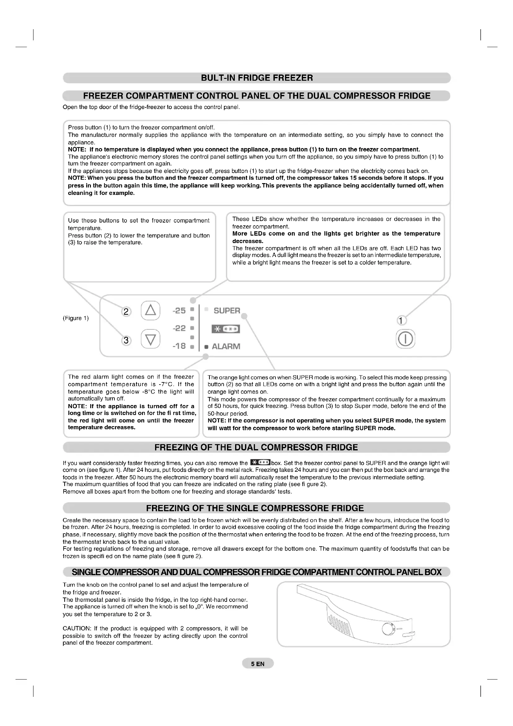 If you want considerably faster freezing times, you can also remove the box. Set the freezer control panel to SUPER and the orange light will come on (see fi gure 1). After 24 hours, put foods directly on the metal rack. Freezing takes 24 hours and you can then put the box back and arrange the foods in the freezer. After 50 hours the electronic memory board will automatically reset the temperature to the previous intermediate setting. The maximum quantities of food that you can freeze are indicated on the rating plate (see fi gure 2). Remove all boxes apart from the bottom one for freezing and storage standards‘ tests. Use these buttons to set the freezer compartment temperature. Press button (2) to lower the temperature and button (3) to raise the temperature. The red alarm light comes on if the freezer compartment temperature is -7°C. If the temperature goes below -8°C the light will automatically turn off. NOTE: If the appliance is turned off for a long time or is switched on for the fi rst time, the red light will come on until the freezer temperature decreases. The orange light comes on when SUPER mode is working. To select this mode keep pressing button (2) so that all LEDs come on with a bright light and press the button again until the orange light comes on. This mode powers the compressor of the freezer compartment continually for a maximum of 50 hours, for quick freezing. Press button (3) to stop Super mode, before the end of the 50-hour period. NOTE: If the compressor is not operating when you select SUPER mode, the system will watt for the compressor to work before starling SUPER mode. These LEDs show whether the temperature increases or decreases in the freezer compartment. More LEDs come on and the lights get brighter as the temperature decreases. The freezer compartment is off when all the LEDs are off. Each LED has two display modes. A dull light means the freezer is set to an intermediate temperature, while a bright light means the freezer is set to a colder temperature. Press button (1) to turn the freezer compartment on/off. The manufacturer normally supplies the appliance with the temperature on an intermediate setting, so you simply have to connect the appliance. NOTE: if no temperature is displayed when you connect the appliance, press button (1) to turn on the freezer compartment. The appliance‘s electronic memory stores the control panel settings when you turn off the appliance, so you simply have to press button (1) to turn the freezer compartment on again. If the appliances stops because the electricity goes off, press button (1) to start up the fridge-freezer when the electricity comes back on. NOTE: When you press the button and the freezer compartment is turned off, the compressor takes 15 seconds before it stops. If you press in the button again this time, the appliance will keep working. This prevents the appliance being accidentally turned off, when cleaning it for example. 5 EN FREEZER COMPARTMENT CONTROL PANEL OF THE DUAL COMPRESSOR FRIDGE Open the top door of the fridge-freezer to access the control panel.