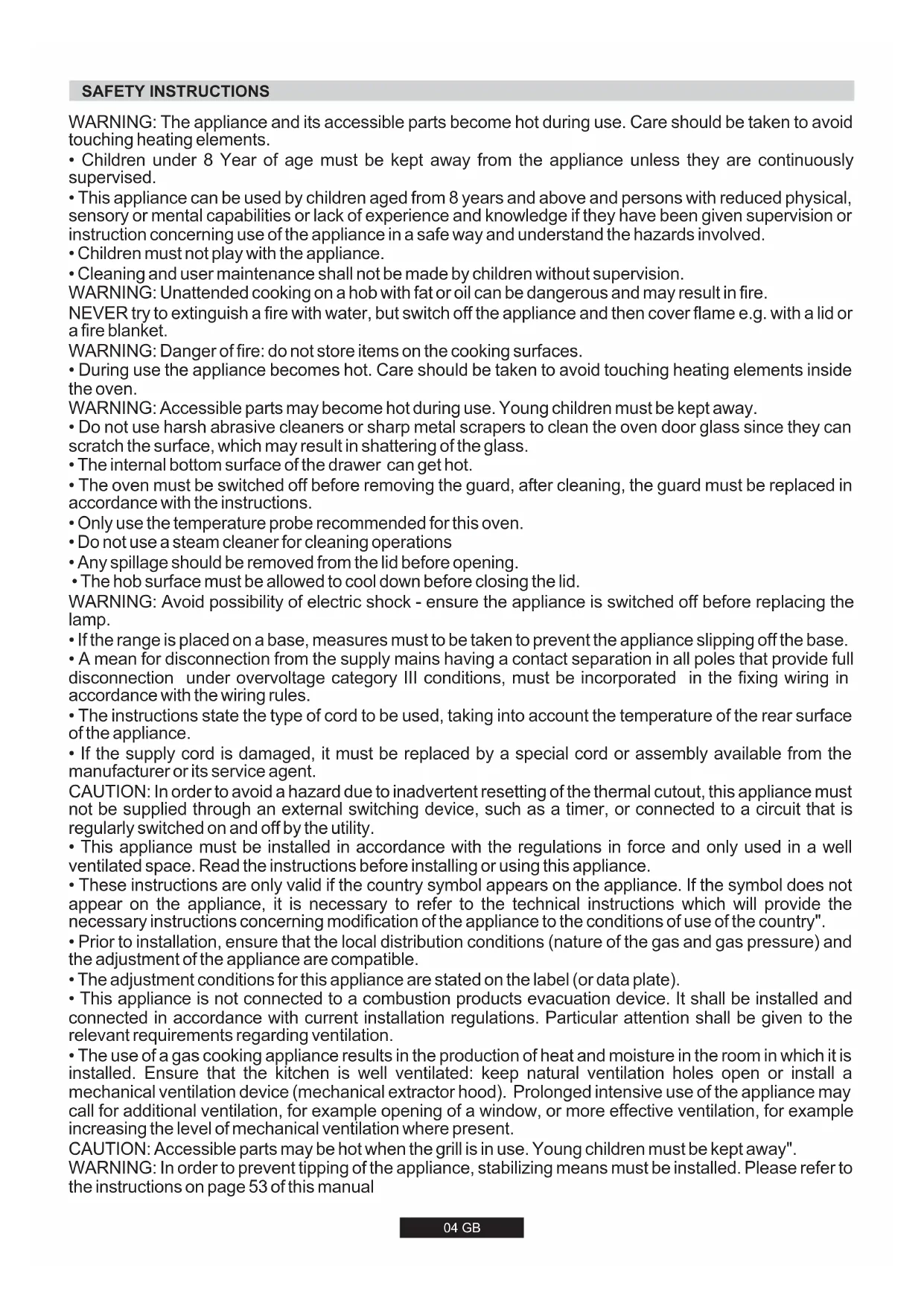 - Do not cover oven parts with aluminium foil. 1.4. USEFUL TIPS If the above instructions are not adhered to, the manufacturer cannot guarantee the safety of the cooker. Caution, possibility of tilting Anti-tip restraints06 GB