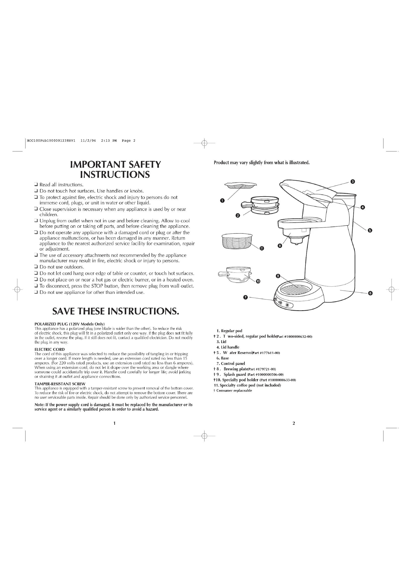 † Consumer replaceable HCC100Pub1000001238RV1 11/2/04 2:13 PM Page 2How to Use This appliance is for household use only. TO PREP THE UNIT BEFORE FIRST USE: