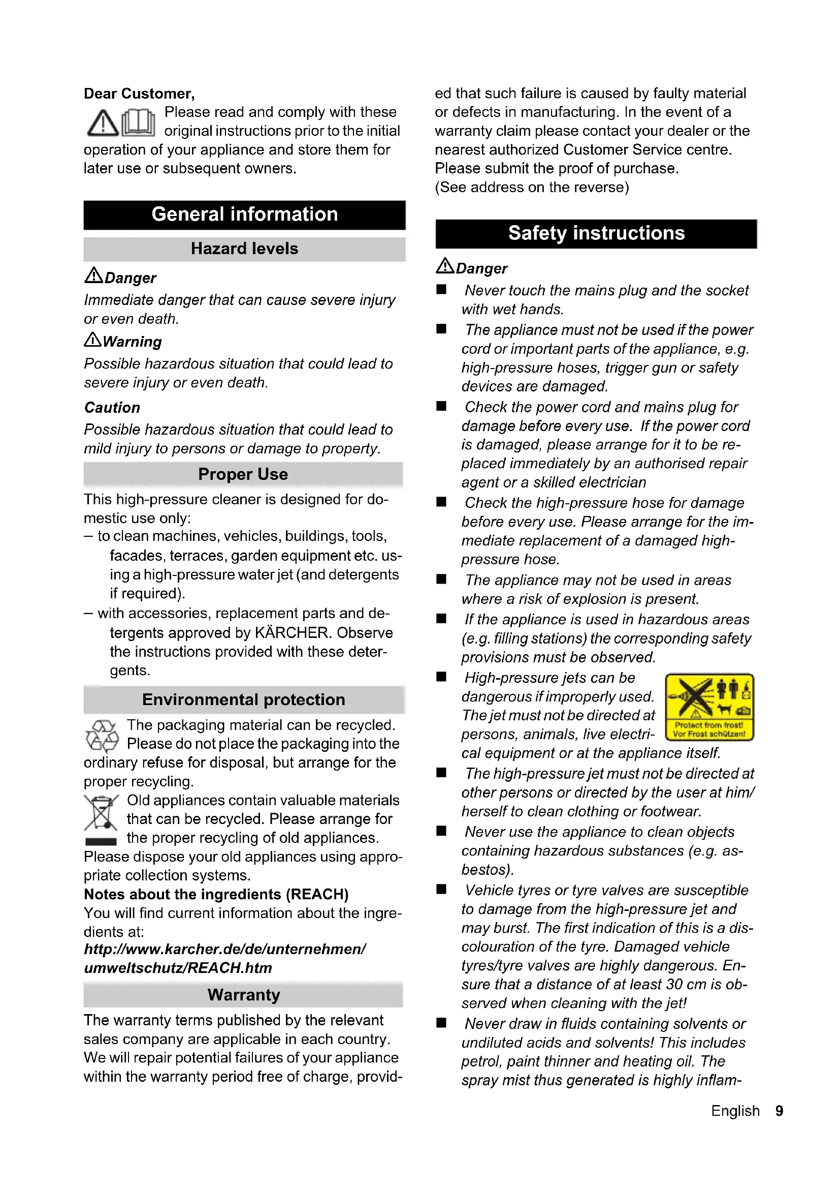 CE-Erklärung Produkt: HochdruckreinigerTyp: 1.636-xxxEinschlägige EG-Richtlinien98/37/EG (bis 28.12.2009)2006/42/EG (ab 29.12.2009) 2004/108/EG2000/14/EGAngewandte harmonisierte NormenEN 55014–1: 2006EN 55014–2: 1997 + A1: 2001EN 60335–1EN 60335–2–79EN 61000–3–2: 2006EN 61000–3–3: 2008EN 62233: 2008Angewandtes Konformitätsbewertungsver-fahrenAnhang VSchallleistungspegel dB(A)K 3.91 MGemessen: 84 Garantiert: 85 K 4.91 MGemessen: 84 Garantiert: 86 CEO Head of Approbation 8 DeutschDeutsch 3 Dear Customer, Please read and comply with these original instructions prior to the initial operation of your appliance and store them for later use or subsequent owners. Danger Immediate danger that can cause severe injury or even death. 몇 Warning Possible hazardous situation that could lead to severe injury or even death. Caution Possible hazardous situation that could lead to mild injury to persons or damage to property. This high-pressure cleaner is designed for do- mestic use only: – to clean machines, vehicles, buildings, tools, facades, terraces, garden equipment etc. us- ing a high-pressure water jet (and detergents if required). – with accessories, replacement parts and de- tergents approved by KÄRCHER. Observe the instructions provided with these deter- gents. The packaging material can be recycled. Please do not place the packaging into the ordinary refuse for disposal, but arrange for the proper recycling. Old appliances contain valuable materials that can be recycled. Please arrange for the proper recycling of old appliances. Please dispose your old appliances using appro- priate collection systems. Notes about the ingredients (REACH) You will find current information about the ingre- dients at: http://www.karcher.de/de/unternehmen/ umweltschutz/REACH.htm The warranty terms published by the relevant sales company are applicable in each country. We will repair potential failures of your appliance within the warranty period free of charge, provid- ed that such failure is caused by faulty material or defects in manufacturing. In the event of a warranty claim please contact your dealer or the nearest authorized Customer Service centre. Please submit the proof of purchase. (See address on the reverse) Danger Never touch the mains plug and the socket with wet hands. The appliance must not be used if the power cord or important parts of the appliance, e.g. high-pressure hoses, trigger gun or safety devices are damaged. Check the power cord and mains plug for damage before every use. If the power cord is damaged, please arrange for it to be re- placed immediately by an authorised repair agent or a skilled electrician Check the high-pressure hose for damage before every use. Please arrange for the im- mediate replacement of a damaged high- pressure hose. The appliance may not be used in areas where a risk of explosion is present. If the appliance is used in hazardous areas (e.g. filling stations) the corresponding safety provisions must be observed. High-pressure jets can be dangerous if improperly used. The jet must not be directed at persons, animals, live electri- cal equipment or at the appliance itself. The high-pressure jet must not be directed at other persons or directed by the user at him/ herself to clean clothing or footwear. Never use the appliance to clean objects containing hazardous substances (e.g. as- bestos). Vehicle tyres or tyre valves are susceptible to damage from the high-pressure jet and may burst. The first indication of this is a dis- colouration of the tyre. Damaged vehicle tyres/tyre valves are highly dangerous. En- sure that a distance of at least 30 cm is ob- served when cleaning with the jet! Never draw in fluids containing solvents or undiluted acids and solvents! This includes petrol, paint thinner and heating oil. The spray mist thus generated is highly inflam- General information Hazard levels Proper Use Environmental protection Warranty Safety instructions English 94 Deutsch mable, explosive and poisonous. Do not use acetone, undiluted acids and solvents as they are damaging to the materials from which the appliance is made.