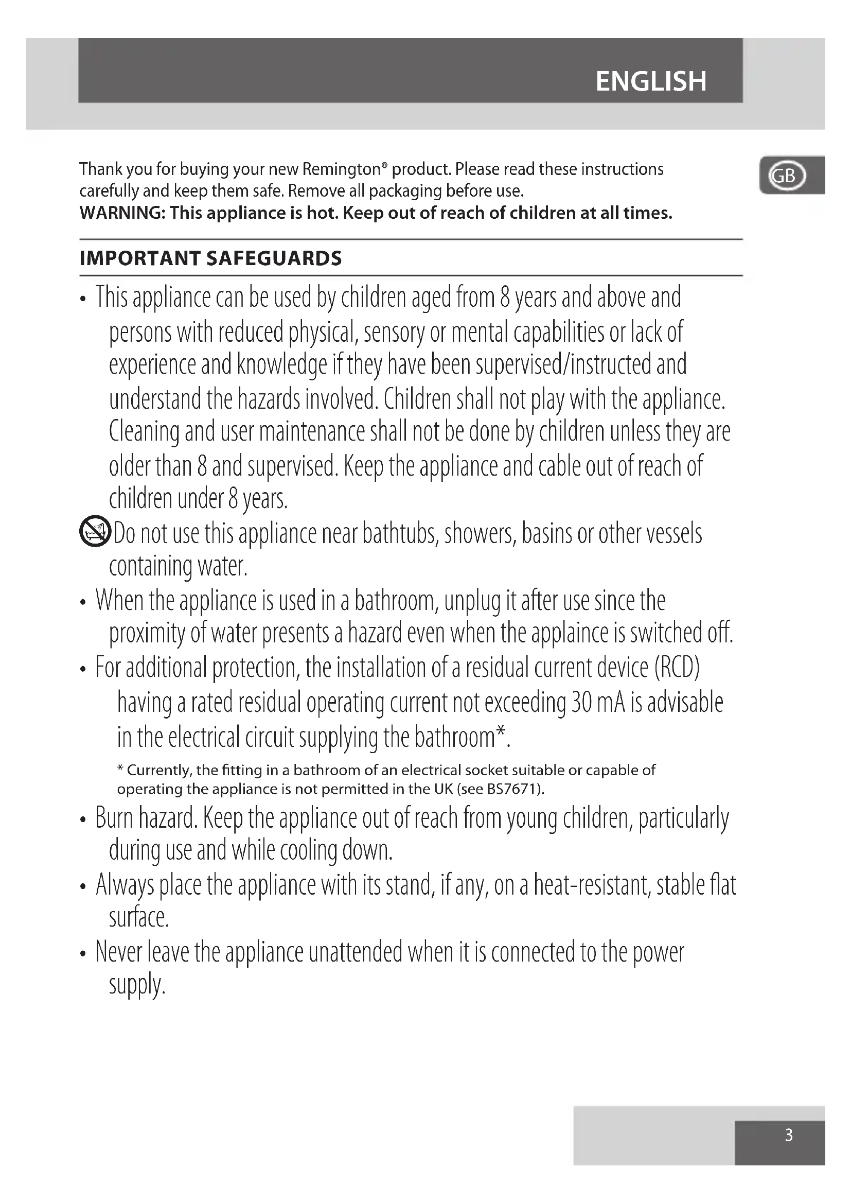A B3 Thank you for buying your new Remington® product. Please read these instructions carefully and keep them safe. Remove all packaging before use.