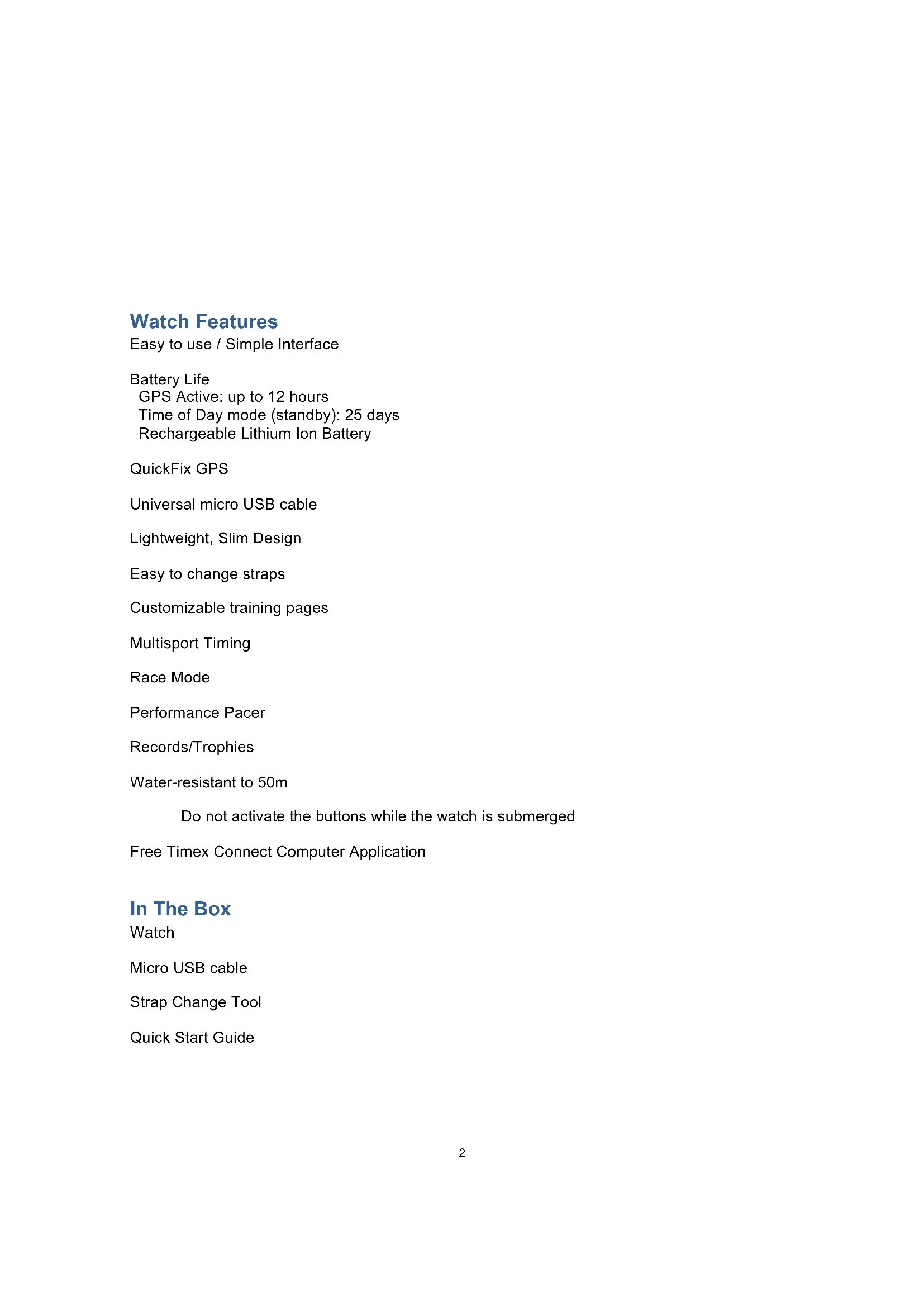 Watch Features Easy to use / Simple Interface Battery Life GPS Active: up to 12 hours Time of Day mode (standby): 25 days Rechargeable Lithium Ion Battery QuickFix GPS Universal micro USB cable Lightweight, Slim Design Easy to change straps Customizable training pages Multisport Timing Race Mode Performance Pacer Records/Trophies Water-resistant to 50m Do not activate the buttons while the watch is submerged Free Timex Connect Computer Application In The Box Watch Micro USB cable Strap Change Tool Quick Start Guide3 Getting Started This owner’s manual will take you through all the features and functions of your new TIMEX