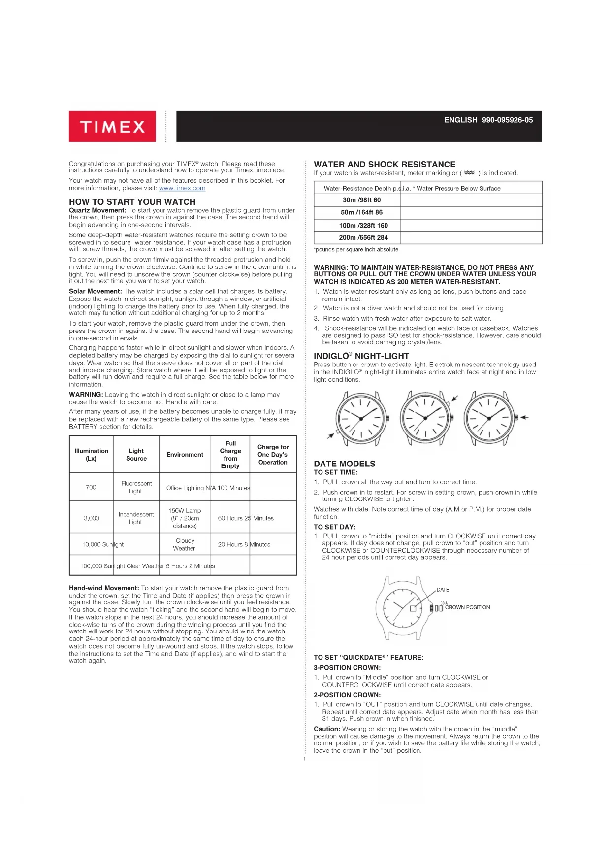 Quartz Movement: To start your watch remove the plastic guard from under the crown, then press the crown in against the case… The second hand will begin advancing in one-second intervals… Some deep-depth water-resistant watches require the setting crown to be screwed in to secure water-resistance… If your watch case has a protrusion with screw threads, the crown must be screwed in after setting the watch… To screw in, push the crown rmly against the threaded protrusion and hold in while turning the crown clockwise… Continue to screw in the crown until it is tight… You will need to unscrew the crown (counter-clockwise) before pulling it out the next time you want to set your watch… Solar Movement: The watch includes a solar cell that charges its battery… Expose the watch in direct sunlight, sunlight through a window, or articial (indoor) lighting to charge the battery prior to use… When fully charged, the watch may function without additional charging for up to 2 months… To start your watch, remove the plastic guard from under the crown, then press the crown in against the case… The second hand will begin advancing in one-second intervals… Charging happens faster while in direct sunlight and slower when indoors… A depleted battery may be charged by exposing the dial to sunlight for several days… Wear watch so that the sleeve does not cover all or part of the dial and impede charging… Store watch where it will be exposed to light or the battery will run down and require a full charge… See the table below for more information…