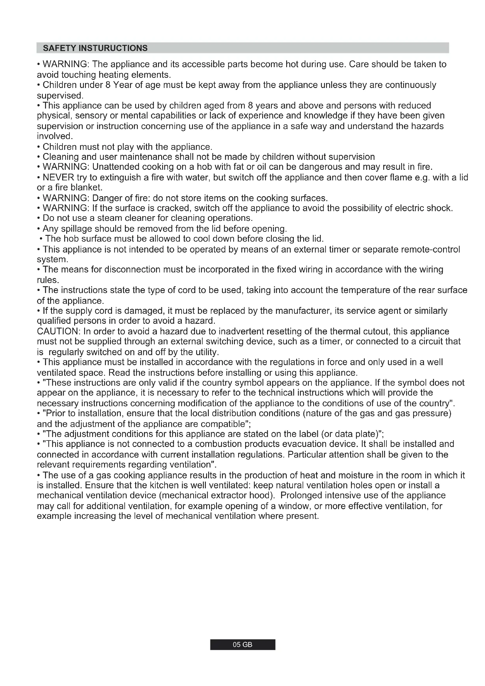 - The use of a gas cooking appliance results in the production of heat and moisture in the room in which it is installed. Ensure that the kitchen is well ventilated: keep natural ventilation holes open or install a mechanical ventilation device (mechanical extractor hood). Prolonged intensive use of the appliance may call for additional ventilation, for example opening of a window, or more effective ventilation, for example increasing the level of mechanical ventilation where present.If an appliance is not fitted with a supply cord and a plug, or with other means for disconnection from the supply mains having a contact separation in all poles that provide full disconnection under overvoltage category III conditions, the instructions shall state that means for disconnection must be incorporated in the fixed wiring in accordance with the wiring rules. 06 GB