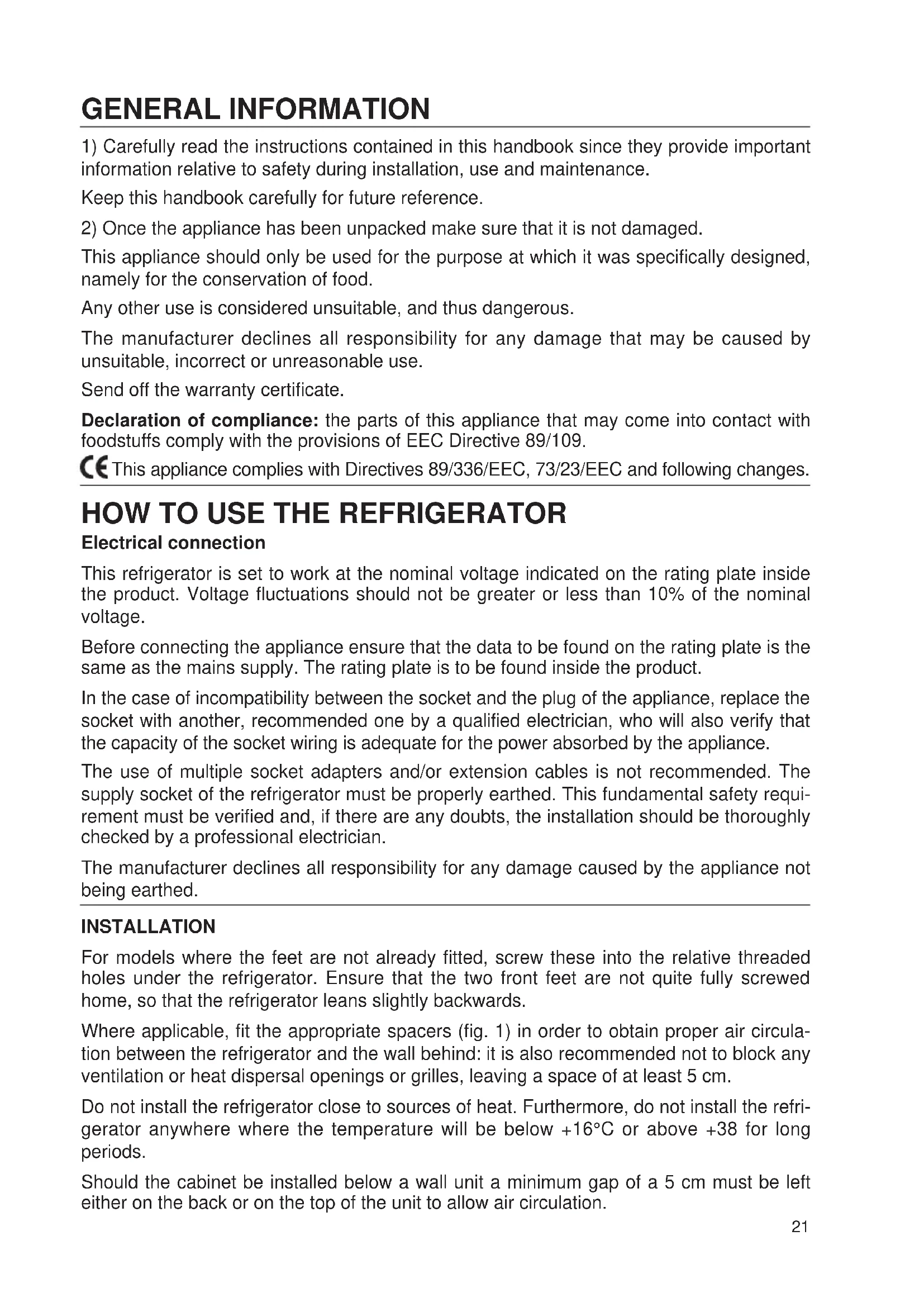 This appliance should only be used for the purpose at which it was specifically designed, namely for the conservation of food. Any other use is considered unsuitable, and thus dangerous. The manufacturer declines all responsibility for any damage that may be caused by unsuitable, incorrect or unreasonable use. Send off the warranty certificate. Declaration of compliance: the parts of this appliance that may come into contact with foodstuffs comply with the provisions of EEC Directive 89/109. This appliance complies with Directives 89/336/EEC, 73/23/EEC and following changes.