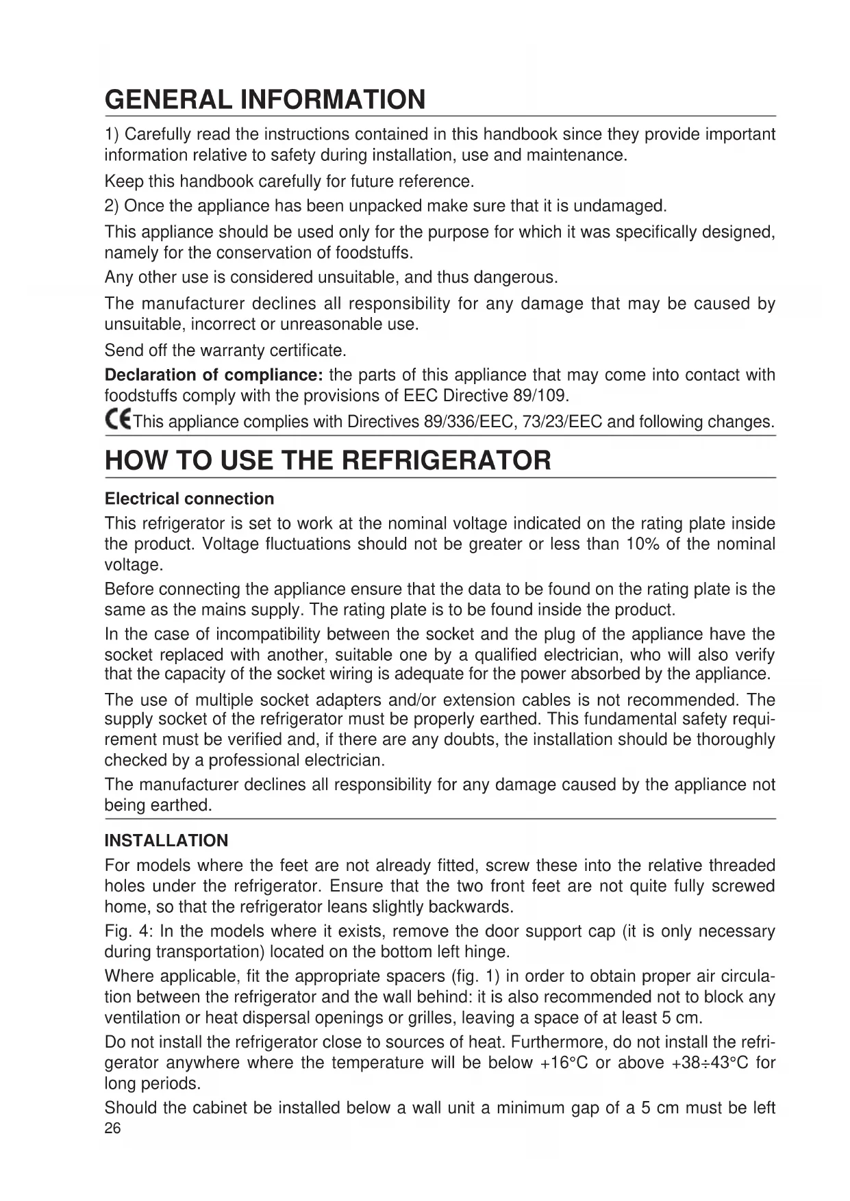This appliance should be used only for the purpose for which it was specifically designed, namely for the conservation of foodstuffs. Any other use is considered unsuitable, and thus dangerous. The manufacturer declines all responsibility for any damage that may be caused by unsuitable, incorrect or unreasonable use. Send off the warranty certificate. Declaration of compliance: the parts of this appliance that may come into contact with foodstuffs comply with the provisions of EEC Directive 89/109. This appliance complies with Directives 89/336/EEC, 73/23/EEC and following changes.