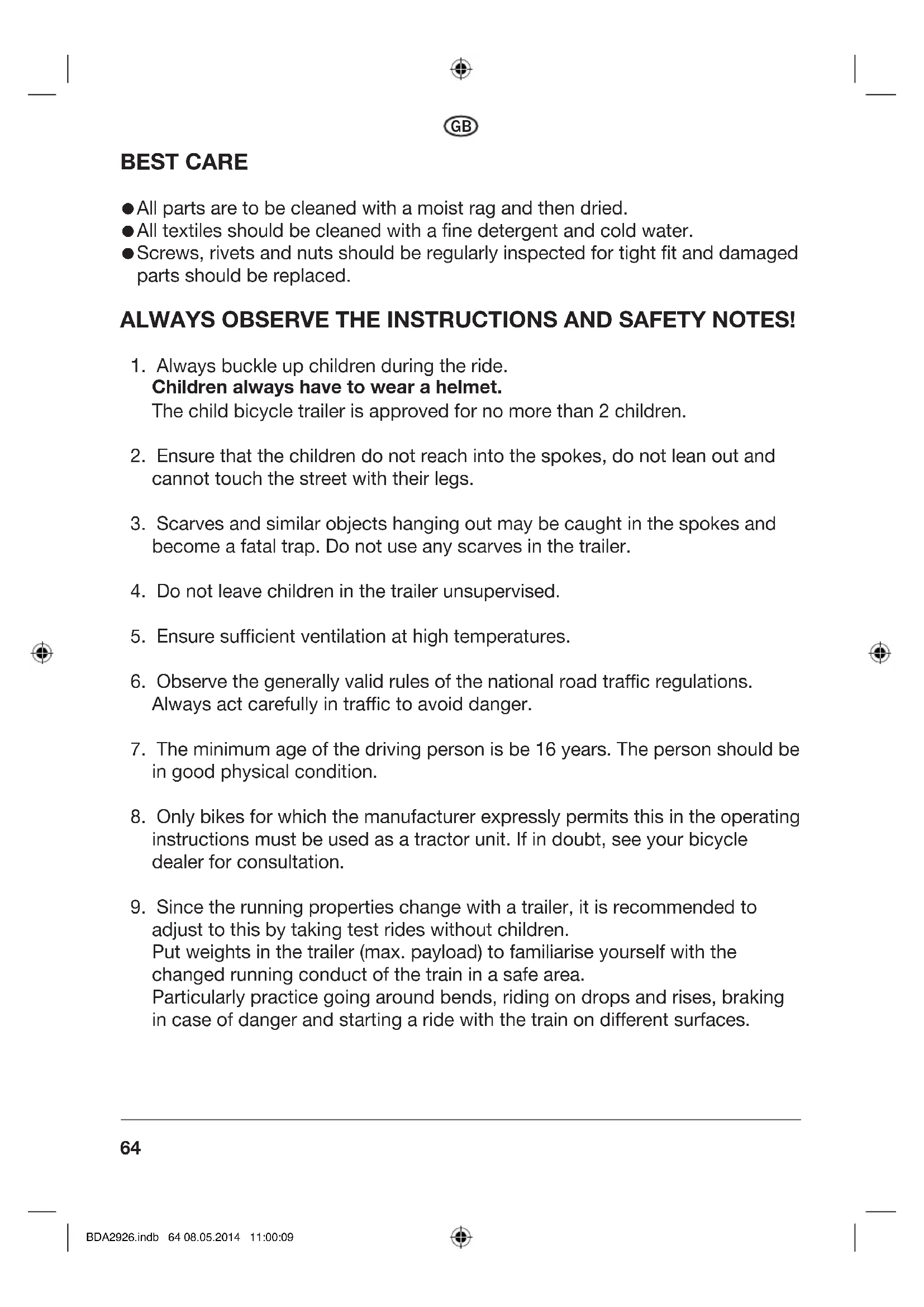 adjust to this by taking test rides without children. Put weights in the trailer (max. payload) to familiarise yourself with the changed running conduct of the train in a safe area. Particularly practice going around bends, riding on drops and rises, braking in case of danger and starting a ride with the train on dierent surfaces. BDA2926.indb 64 08.05.2014 11:00:0965