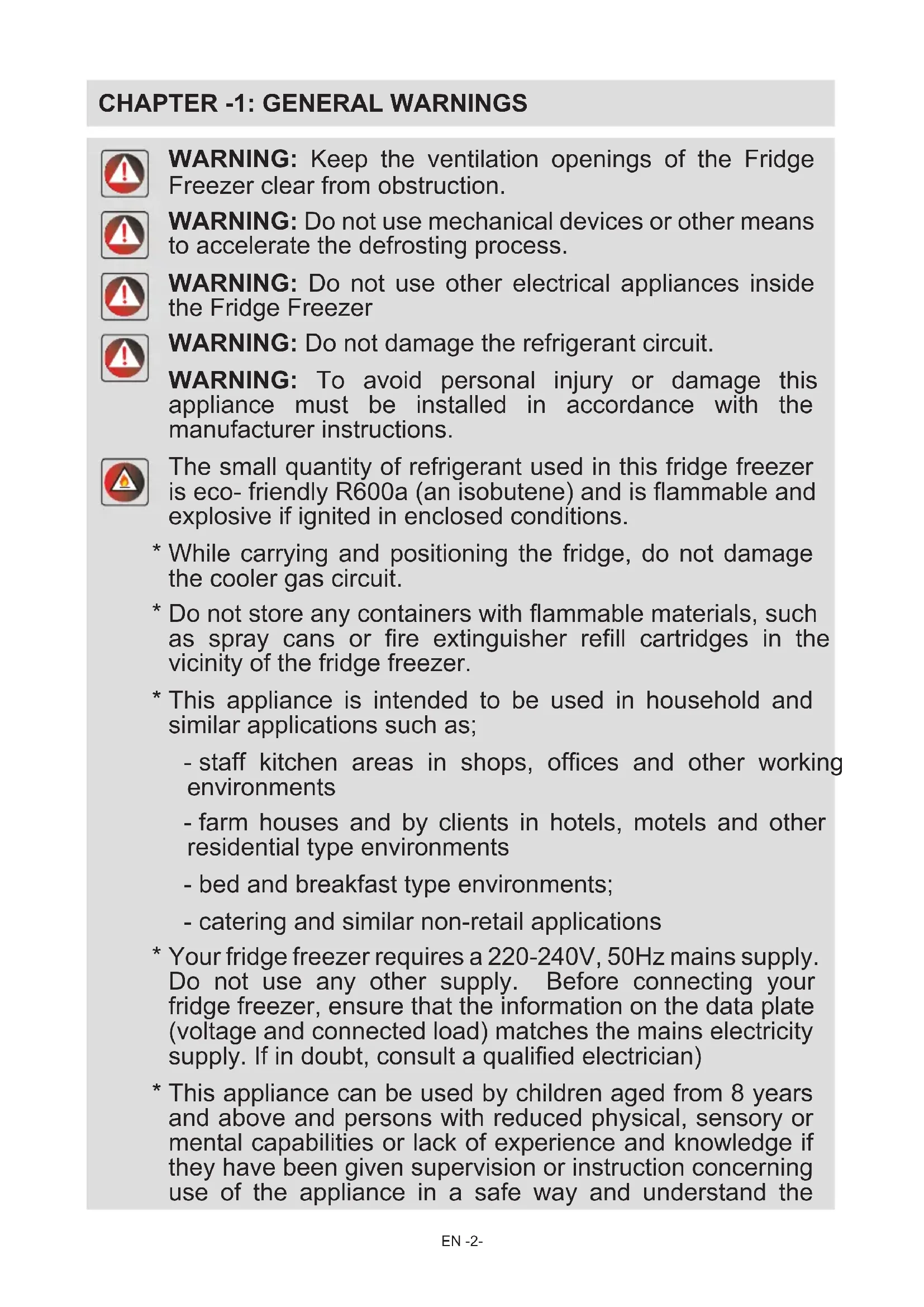 - Do not store any containers with ammable materials, such as spray cans or re extinguisher rell cartridges in the vicinity of the fridge freezer.