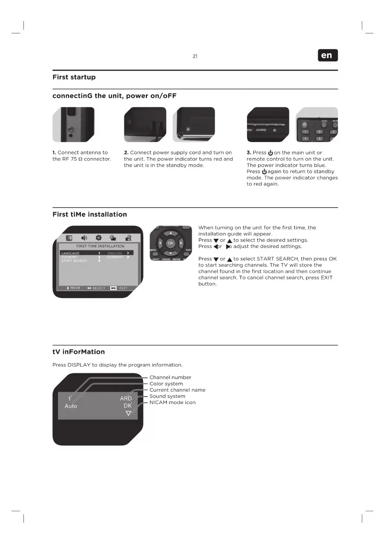 to select START SEARCH, then press OK to start searching channels. The TV will store the channel found in the first location and then continue channel search. To cancel channel search, press EXIT button. First tiMe installation Press DISPLAY to display the program information. Channel number Color system Current channel name Sound system NICAM mode icon tV inForMation
