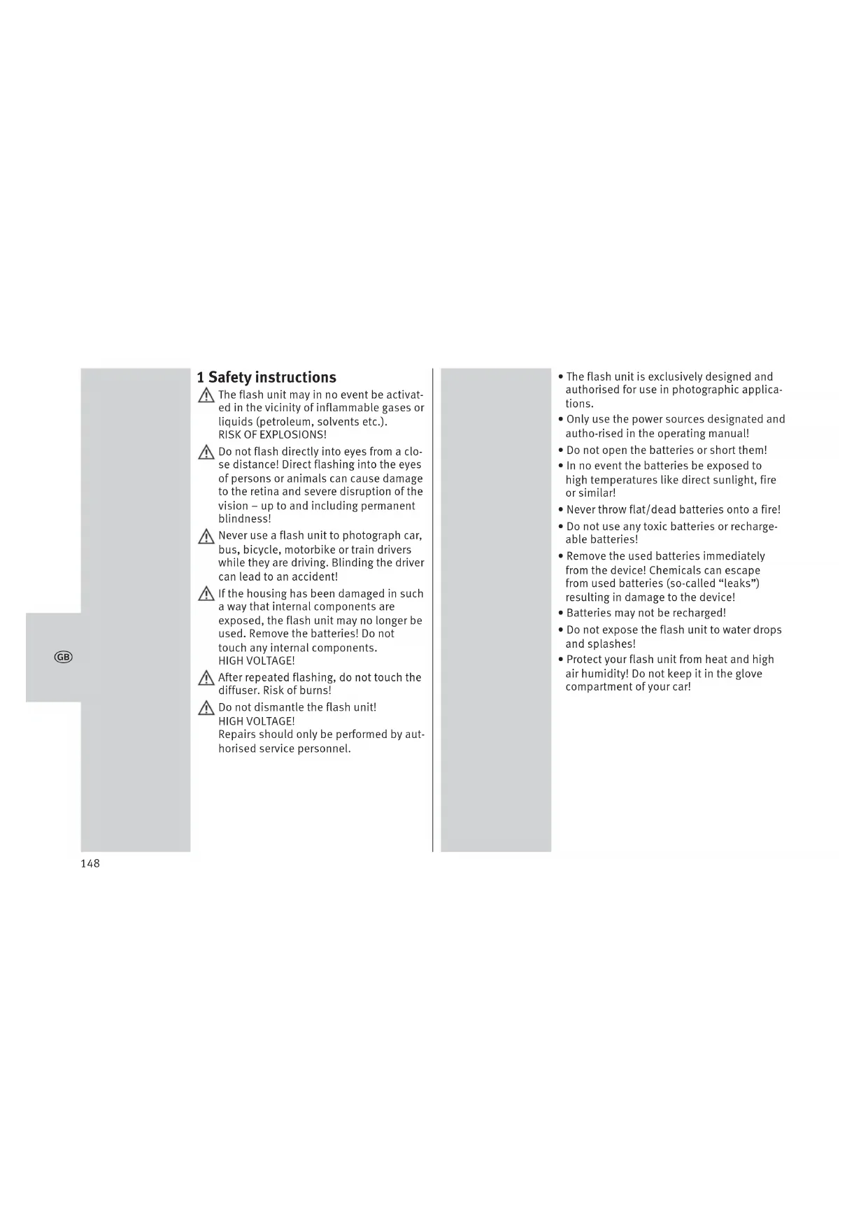 k1 Safety instructions The flash unit may in no event be activat- ed in the vicinity of inflammable gases or liquids (petroleum, solvents etc.). RISK OF EXPLOSIONS! Do not flash directly into eyes from a clo- se distance! Direct flashing into the eyes of persons or animals can cause damage to the retina and severe disruption of the vision – up to and including permanent blindness! Never use a flash unit to photograph car, bus, bicycle, motorbike or train drivers while they are driving. Blinding the driver can lead to an accident! If the housing has been damaged in such a way that internal components are exposed, the flash unit may no longer be used. Remove the batteries! Do not touch any internal components. HIGH VOLTAGE! After repeated flashing, do not touch the diffuser. Risk of burns! Do not dismantle the flash unit! HIGH VOLTAGE! Repairs should only be performed by aut- horised service personnel.