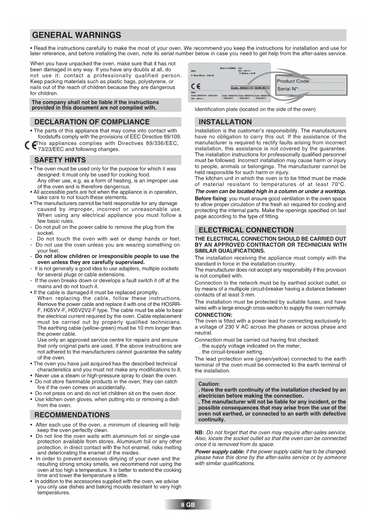 cuisson Temps de cuisson Conseils Niveau gradin• Read the instructions carefully to make the most of your oven. We recommend you keep the instructions for installation and use for later reference, and before installing the oven, note its serial number below in case you need to get help from the after-sales service. The company shall not be liable if the instructions provided in this document are not complied with. GENERAL WARNINGS 8 GB