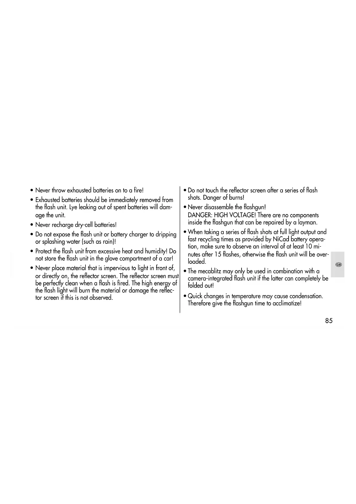 When taking a series of flash shots at full light output and fast recycling times as provided by NiCad battery opera- tion, make sure to observe an interval of at least 10 mi- nutes after 15 flashes, otherwise the flash unit will be over- loaded.