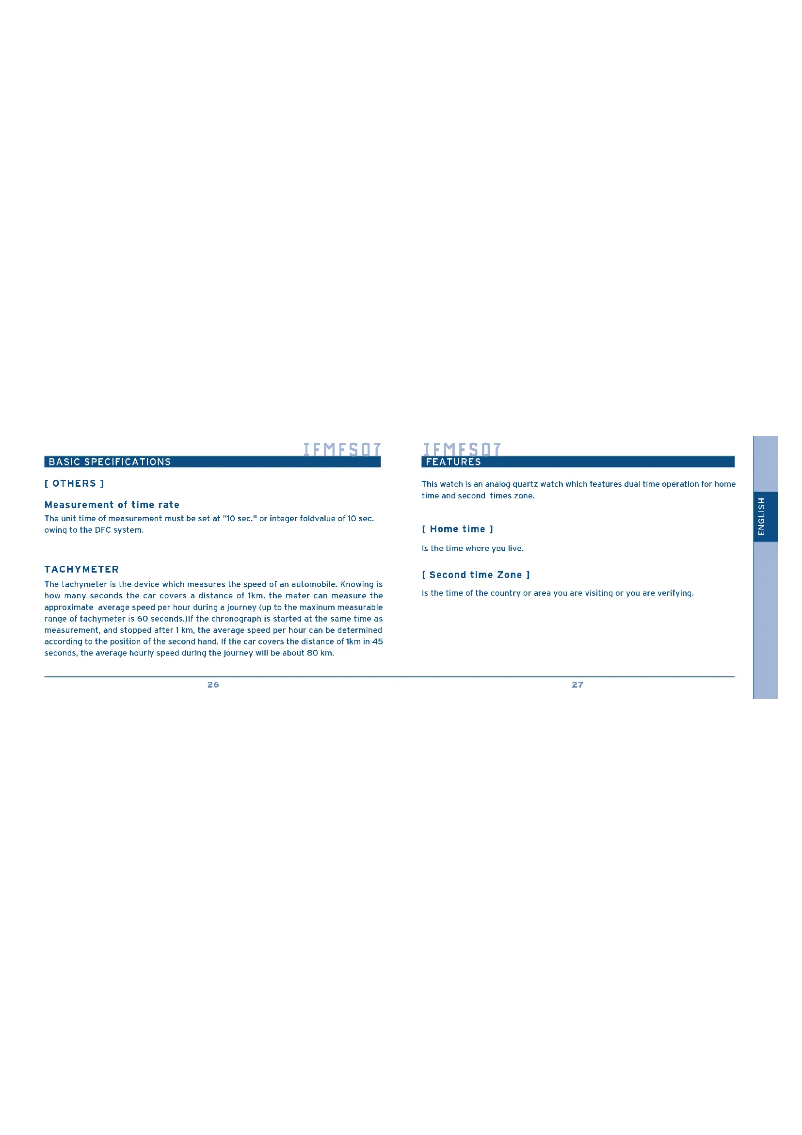 BASIC SPECIFICATIONS [ OTHERS ] The unit time of measurement must be set at "10 sec." or integer foldvalue of 10 sec. owing to the DFC system. TACHYMETER The tachymeter is the device which measures the speed of an automobile. Knowing is how many seconds the car covers a distance of 1km, the meter can measure the approximate average speed per hour during a journey (up to the maxinum measurable range of tachymeter is 60 seconds.)If the chronograph is started at the same time as measurement, and stopped after 1 km, the average speed per hour can be determined according to the position of the second hand. If the car covers the distance of 1km in 45 seconds, the average hourly speed during the journey will be about 80 km. Measurement of time rate FEATURES This watch is an analog quartz watch which features dual time operation for home time and second times zone. [ Home time ] Is the time where you live. [ Second time Zone ] Is the time of the country or area you are visiting or you are verifying. IFMFS07
