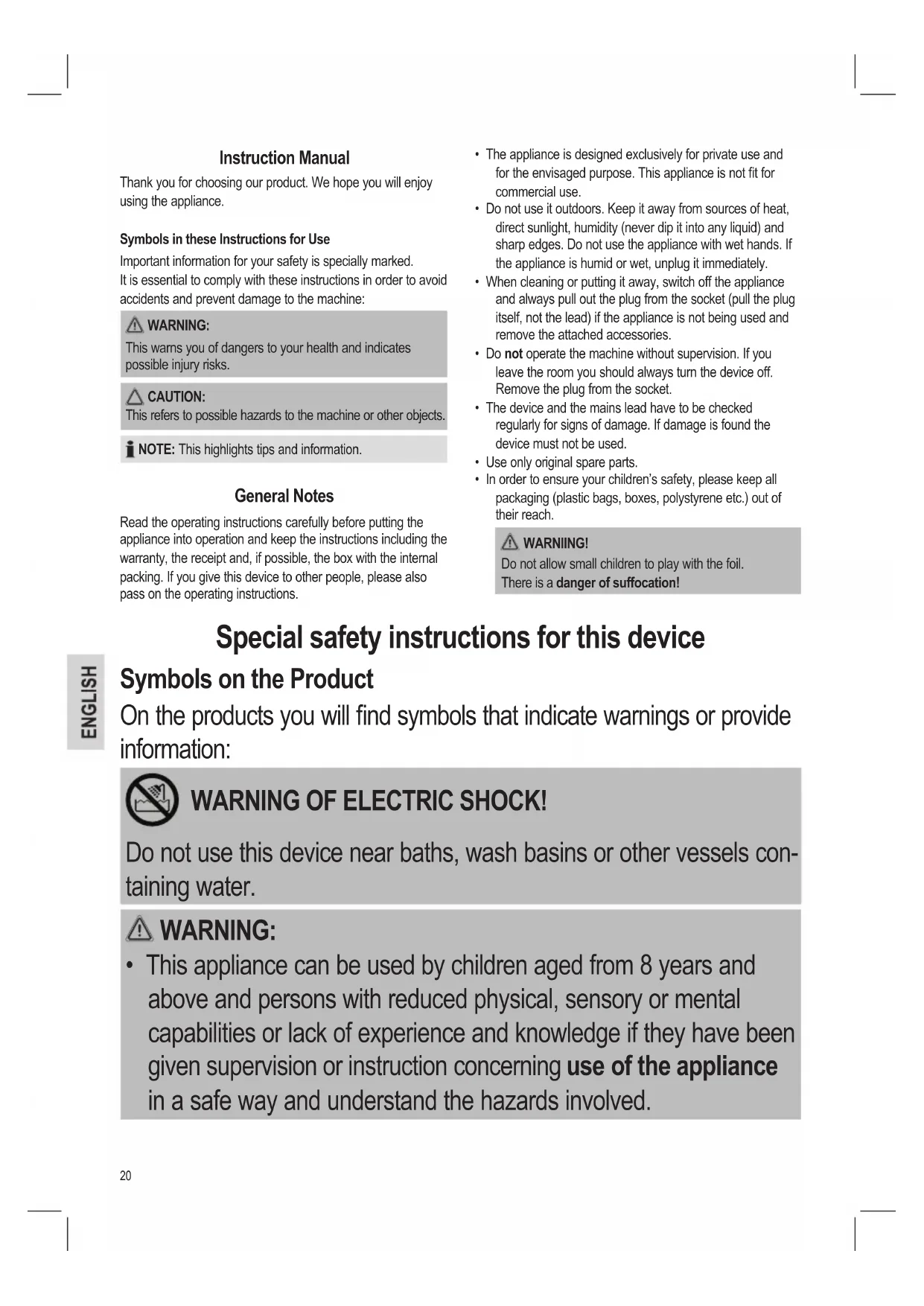 - In order to ensure your children’s safety, please keep all packaging (plastic bags, boxes, polystyrene etc.) out of their reach. WARNIING! Do not allow small children to play with the foil. There is a danger of suffocation! Instruction Manual Thank you for choosing our product. We hope you will enjoy using the appliance. Symbols in these Instructions for Use Important information for your safety is specially marked. It is essential to comply with these instructions in order to avoid accidents and prevent damage to the machine: