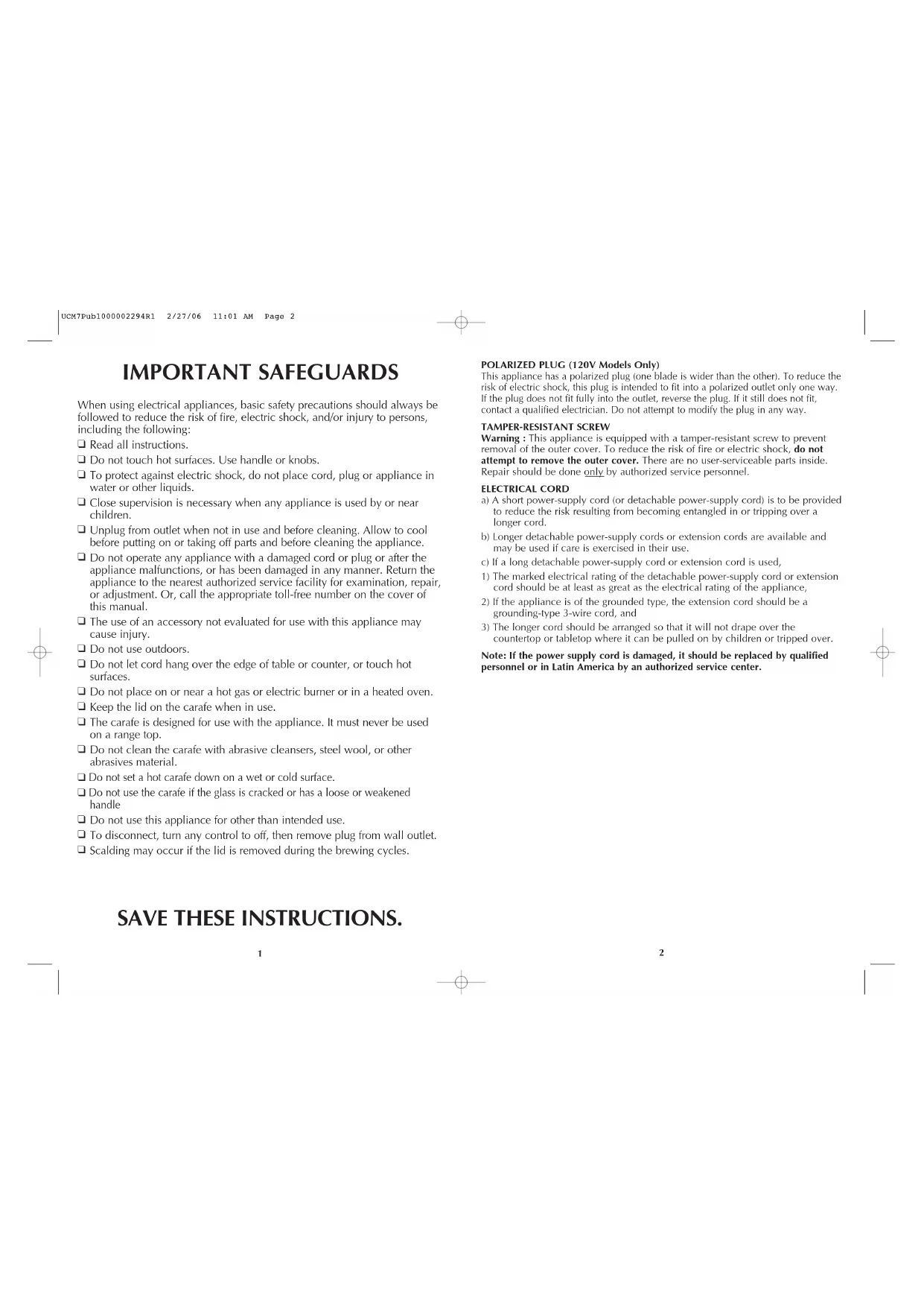 Scalding may occur if the lid is removed during the brewing cycles. SAVE THESE INSTRUCTIONS. POLARIZED PLUG (120V Models Only) This appliance has a polarized plug (one blade is wider than the other). To reduce the risk of electric shock, this plug is intended to fit into a polarized outlet only one way. If the plug does not fit fully into the outlet, reverse the plug. If it still does not fit, contact a qualified electrician. Do not attempt to modify the plug in any way. TAMPER-RESISTANT SCREW