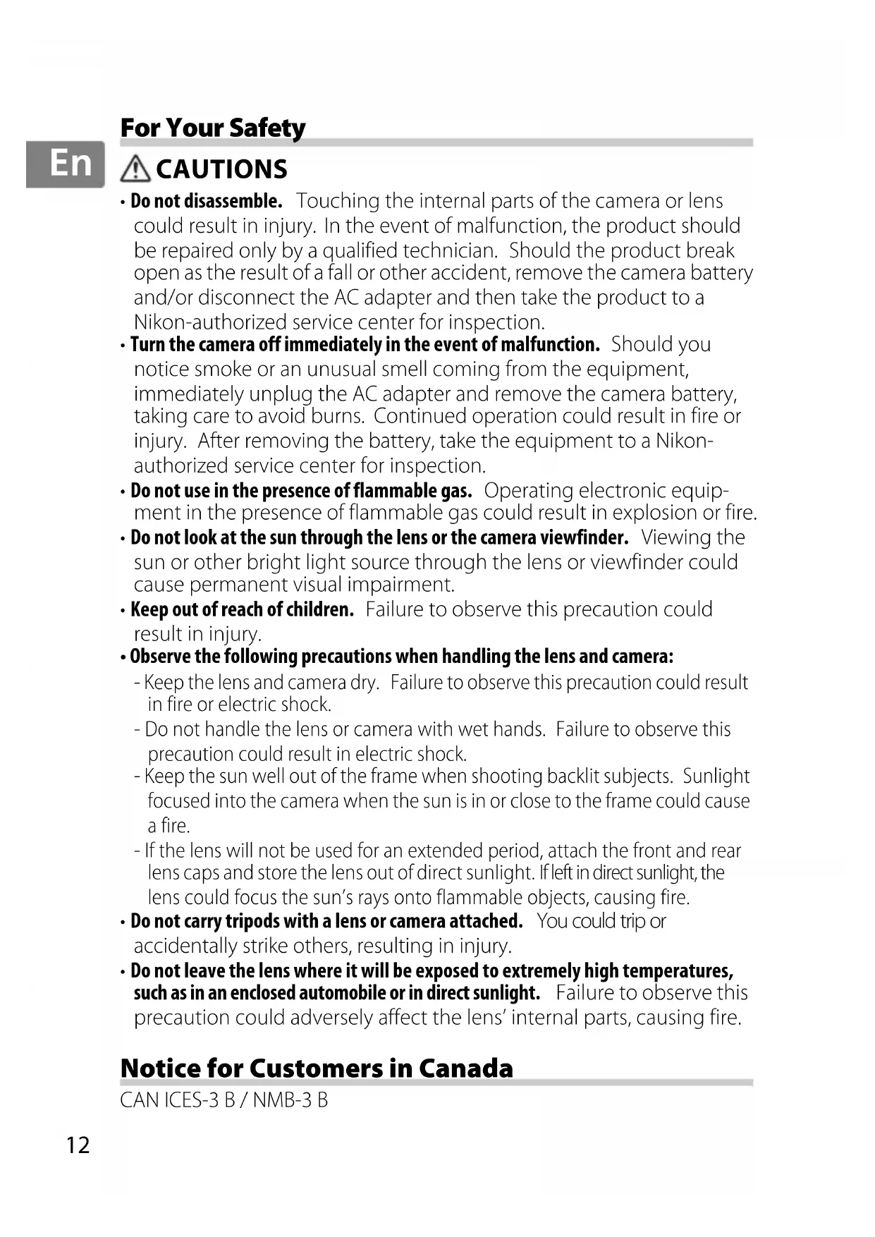 - Do not leave the lens where it will be exposed to extremely high temperatures, such as in an enclosed automobile or in direct sunlight. Failure to observe this precaution could adversely affect the lens’ internal parts, causing fire. Notice for Customers in Canada