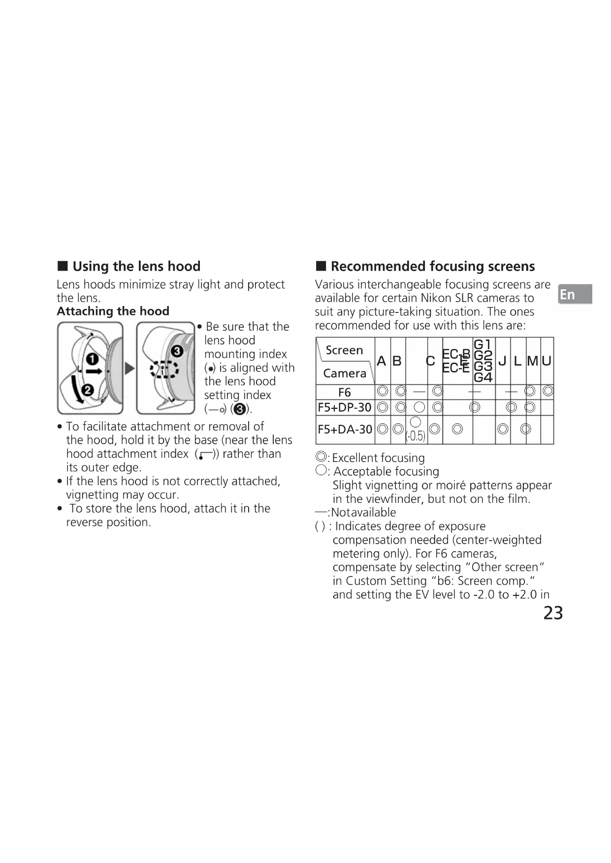 - To store the lens hood, attach it in the reverse position. Recommended focusing screens Various interchangeable focusing screens are available for certain Nikon SLR cameras to suit any picture-taking situation. The ones recommended for use with this lens are: Screen AB C E EC-B EC-E
