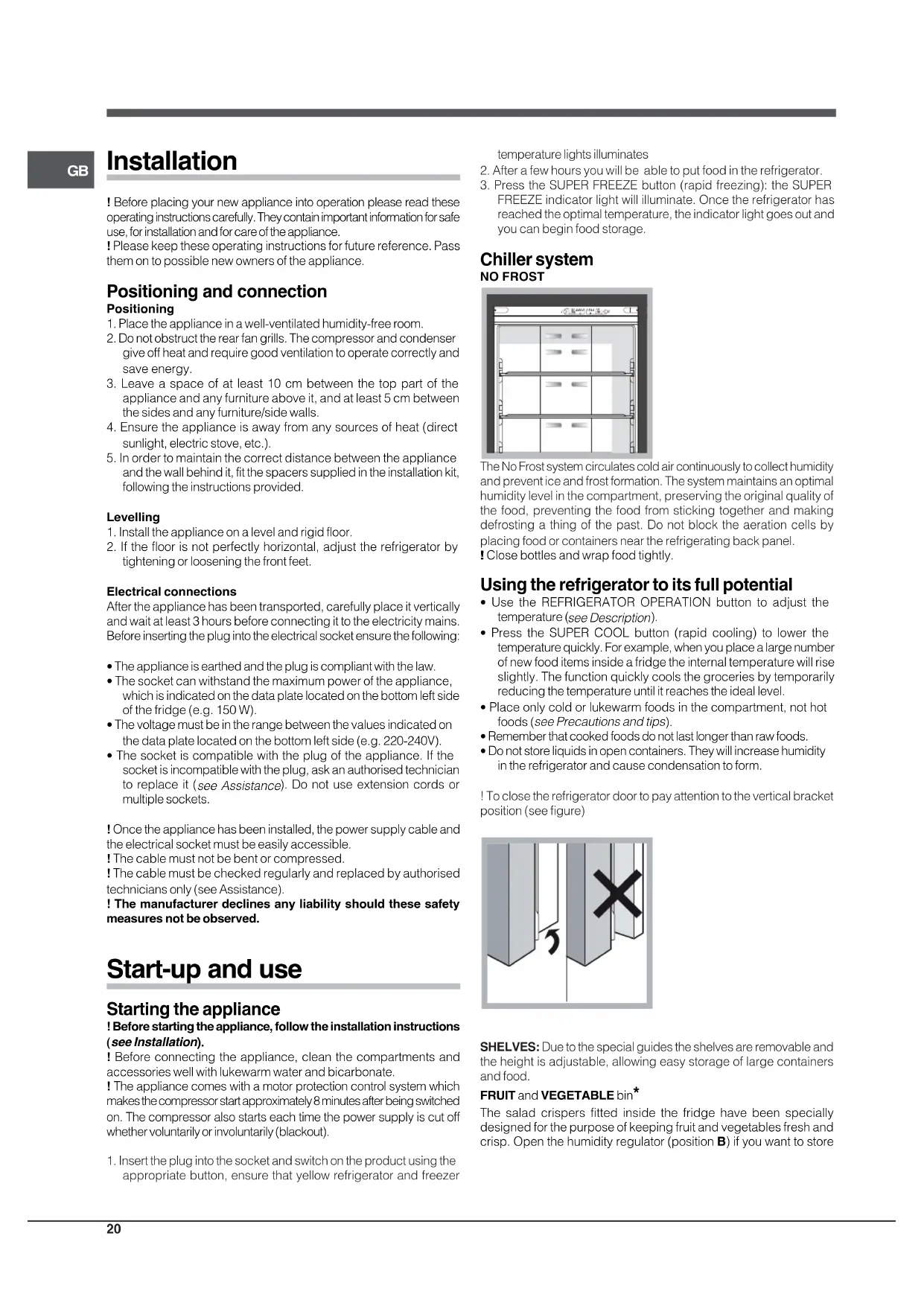 The manufacturer declines any liability should these safetymeasures not be observed. Start-up and use Starting the appliance ! Before starting the appliance, follow the installation instructions