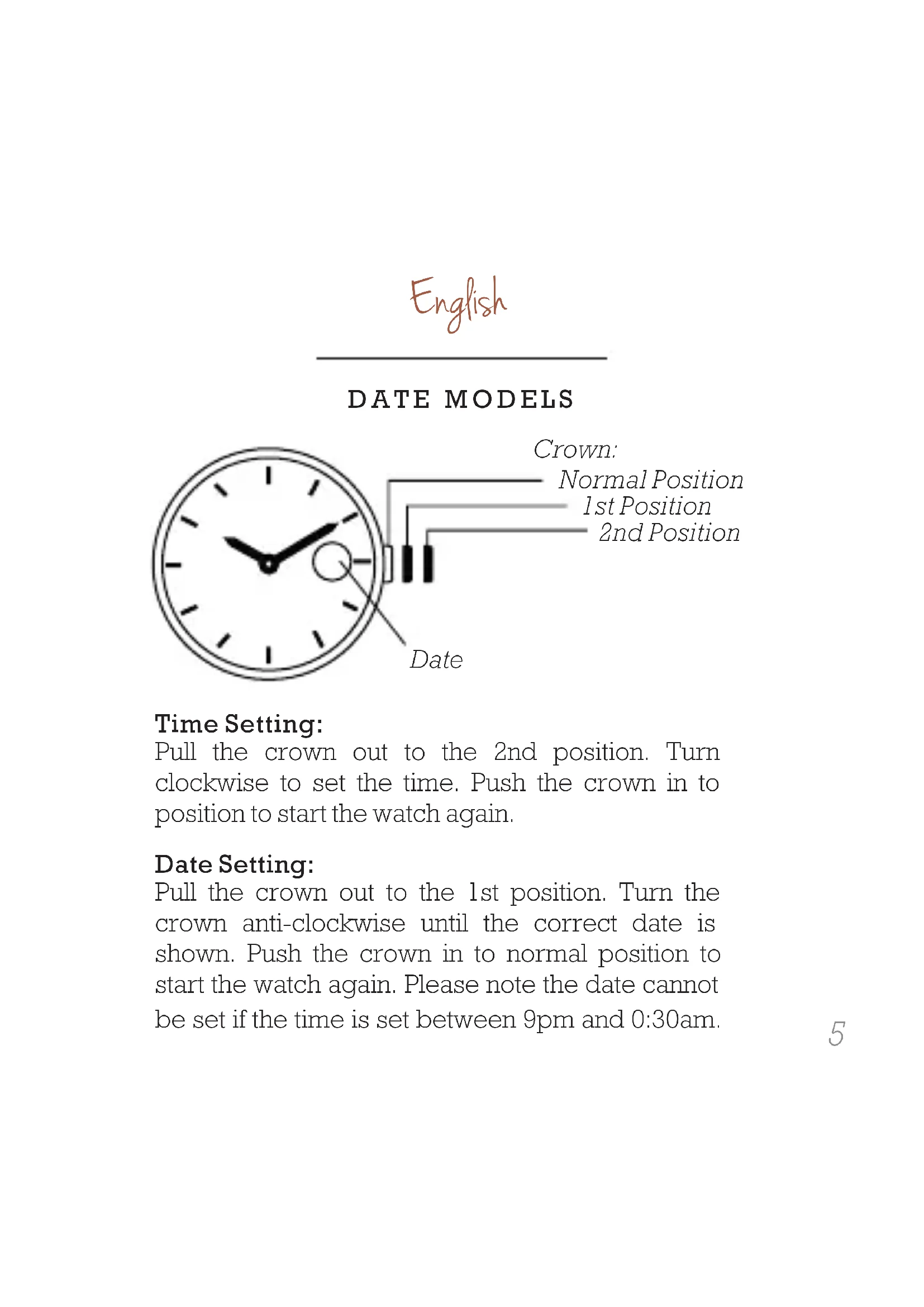 Best friends Lesa Bennett and Jemma Fennings set up Olivia Burton when they couldn’t find a watch that fulfilled their need for style. Named after Lesa’s great aunt whose spirited approach to life was a huge inspiration for the design duo, Olivia Burton combines vintage style and catwalk trends to create a collection of striking and covetable timepieces.Contents Instruction and Warranty English 5 Français 20 Italiano 35 Deutsch 50 Español 66 Português 81 日本語 96 简体中文 111 繁體中文 126 한국어 141 Bahasa Indonesia 1563 Notices English 172 Français 174 Italiano 176 Deutsch 178 Español 180 Português 182 日本語 184 简体中文 186 繁體中文 188 한국어 190 Bahasa Indonesia 192 Retailer Stamp 1955 English DATE MODELS Normal Position 1st Position 2nd Position Date Crown: Pull the crown out to the 2nd position. Turn clockwise to set the time. Push the crown in to position to start the watch again. Time Setting: Pull the crown out to the 1st position. Turn the crown anti-clockwise until the correct date is shown. Push the crown in to normal position to start the watch again. Please note the date cannot be set if the time is set between 9pm and 0:30am. Date Setting:Normal Position 1st Position 2nd Position