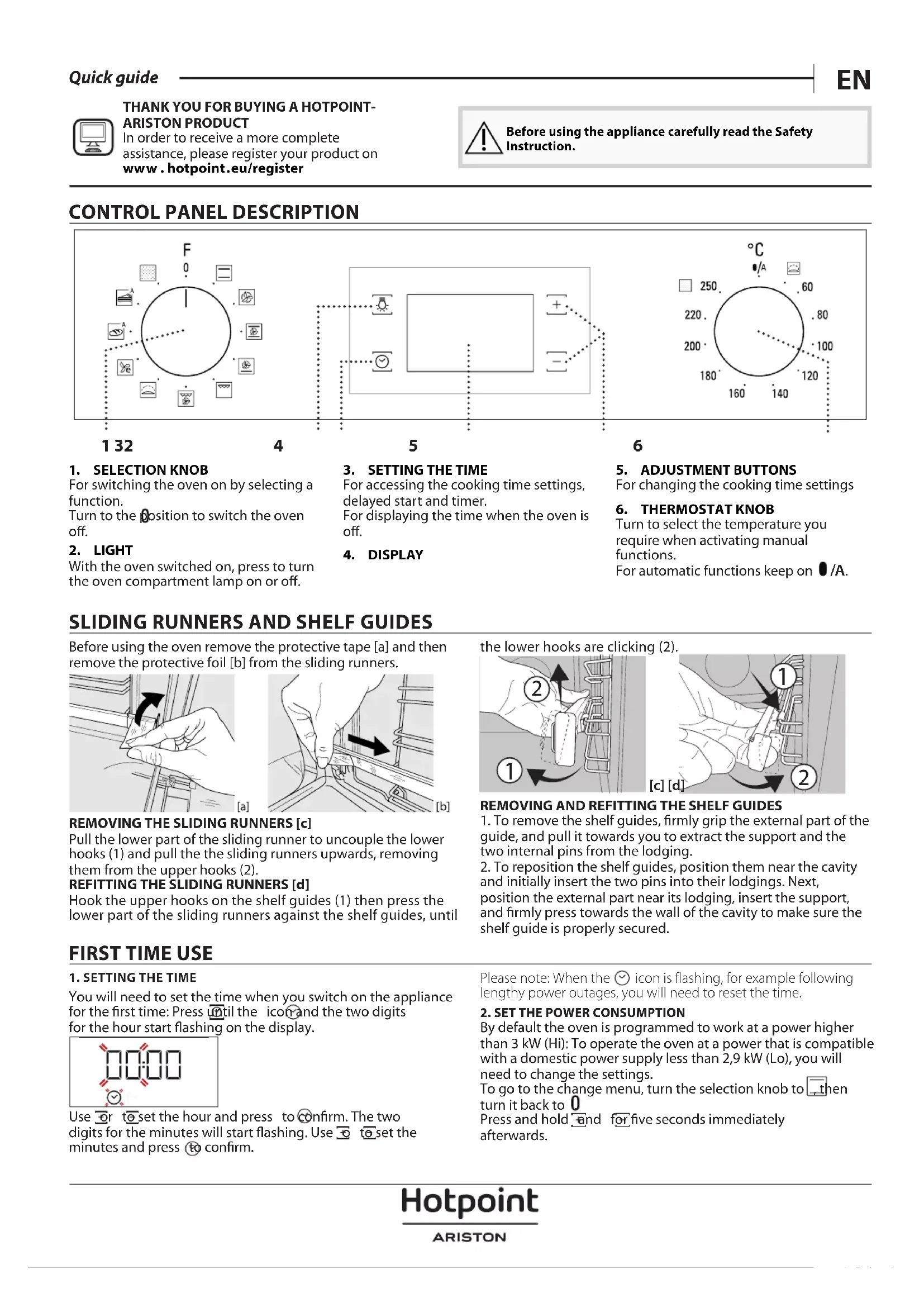 [c] [d]REMOVING AND REFITTING THE SHELF GUIDES1. To remove the shelf guides, rmly grip the external part of the guide, and pull it towards you to extract the support and the two internal pins from the lodging.2. To reposition the shelf guides, position them near the cavity and initially insert the two pins into their lodgings. Next, position the external part near its lodging, insert the support, and rmly press towards the wall of the cavity to make sure the shelf guide is properly secured.FIRST TIME USE1. SETTING THE TIMEYou will need to set the time when you switch on the appliance for the rst time: Press until the icon and the two digits for the hour start ashing on the display.Use or to set the hour and press to conrm. The two digits for the minutes will start ashing. Use o to set the minutes and press to conrm.Please note: When the icon is flashing, for example following lengthy power outages, you will need to reset the time.2. SET THE POWER CONSUMPTIONBy default the oven is programmed to work at a power higher than 3 kW (Hi): To operate the oven at a power that is compatible with a domestic power supply less than 2,9 kW (Lo), you will need to change the settings.To go to the change menu, turn the selection knob to , then turn it back to .Press and hold and for ve seconds immediately afterwards.THANK YOU FOR BUYING A HOTPOINT-ARISTON PRODUCTIn order to receive a more complete assistance, please register your product on ww w . hotpoint . eu/registerBefore using the appliance carefully read the Safety Instruction.CONTROL PANEL DESCRIPTION1 32 4 5 61. SELECTION KNOBFor switching the oven on by selecting a function.Turn to the position to switch the oven 2. LIGHTWith the oven switched on, press to turn the oven compartment lamp on or o.3. SETTING THE TIMEFor accessing the cooking time settings, delayed start and timer.For displaying the time when the oven is