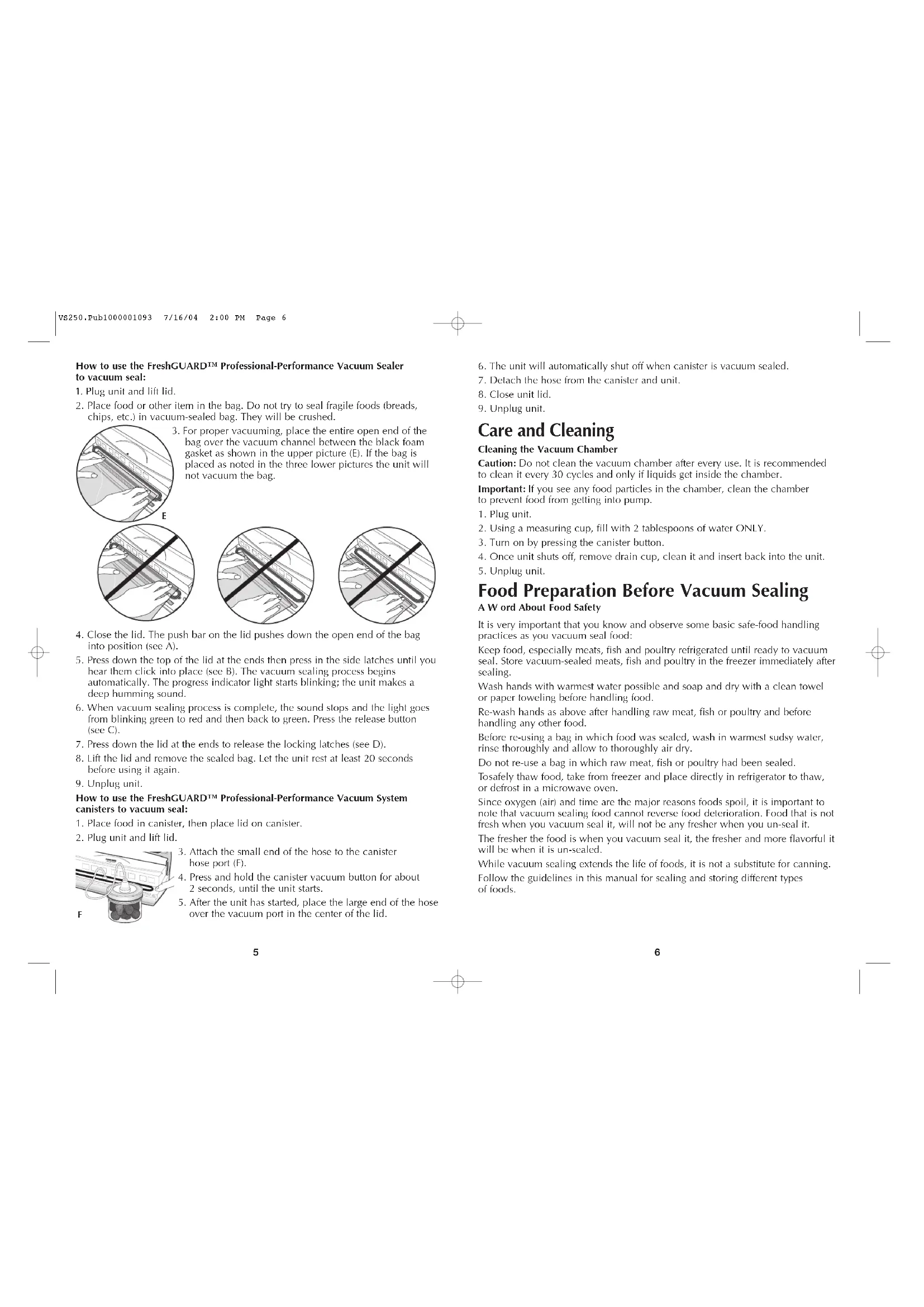 Food Preparation Before Vacuum Sealing AWord About Food Safety It is very important that you know and observe some basic safe-food handling practices as you vacuum seal food: Keep food, especially meats, fish and poultry refrigerated until ready to vacuum seal. Store vacuum-sealed meats, fish and poultry in the freezer immediately after sealing. Wash hands with warmest water possible and soap and dry with a clean towel or paper toweling before handling food. Re-wash hands as above after handling raw meat, fish or poultry and before handling any other food. Before re-using a bag in which food was sealed, wash in warmest sudsy water, rinse thoroughly and allow to thoroughly air dry. Do not re-use a bag in which raw meat, fish or poultry had been sealed. To safely thaw food, take from freezer and place directly in refrigerator to thaw, or defrost in a microwave oven. Since oxygen (air) and time are the major reasons foods spoil, it is important to note that vacuum sealing food cannot reverse food deterioration. Food that is not fresh when you vacuum seal it, will not be any fresher when you un-seal it. The fresher the food is when you vacuum seal it, the fresher and more flavorful it will be when it is un-sealed. While vacuum sealing extends the life of foods, it is not a substitute for canning. Follow the guidelines in this manual for sealing and storing different types of foods.