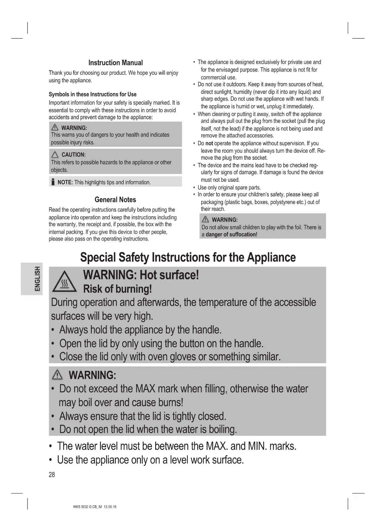- Do not exceed the MAX mark when filling, otherwise the water may boil over and cause burns!