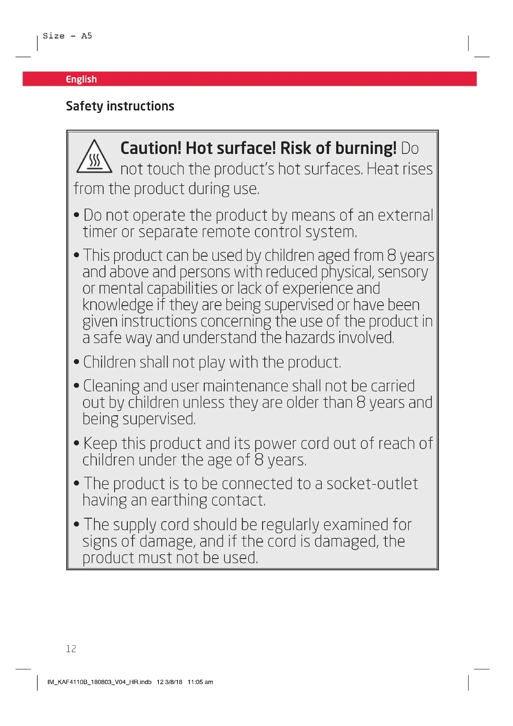 - The supply cord should be regularly examined for signs of damage, and if the cord is damaged, the product must not be used. IM_KAF4110B_180803_V04_HR.indb 12 3/8/18 11:05 amEnglish