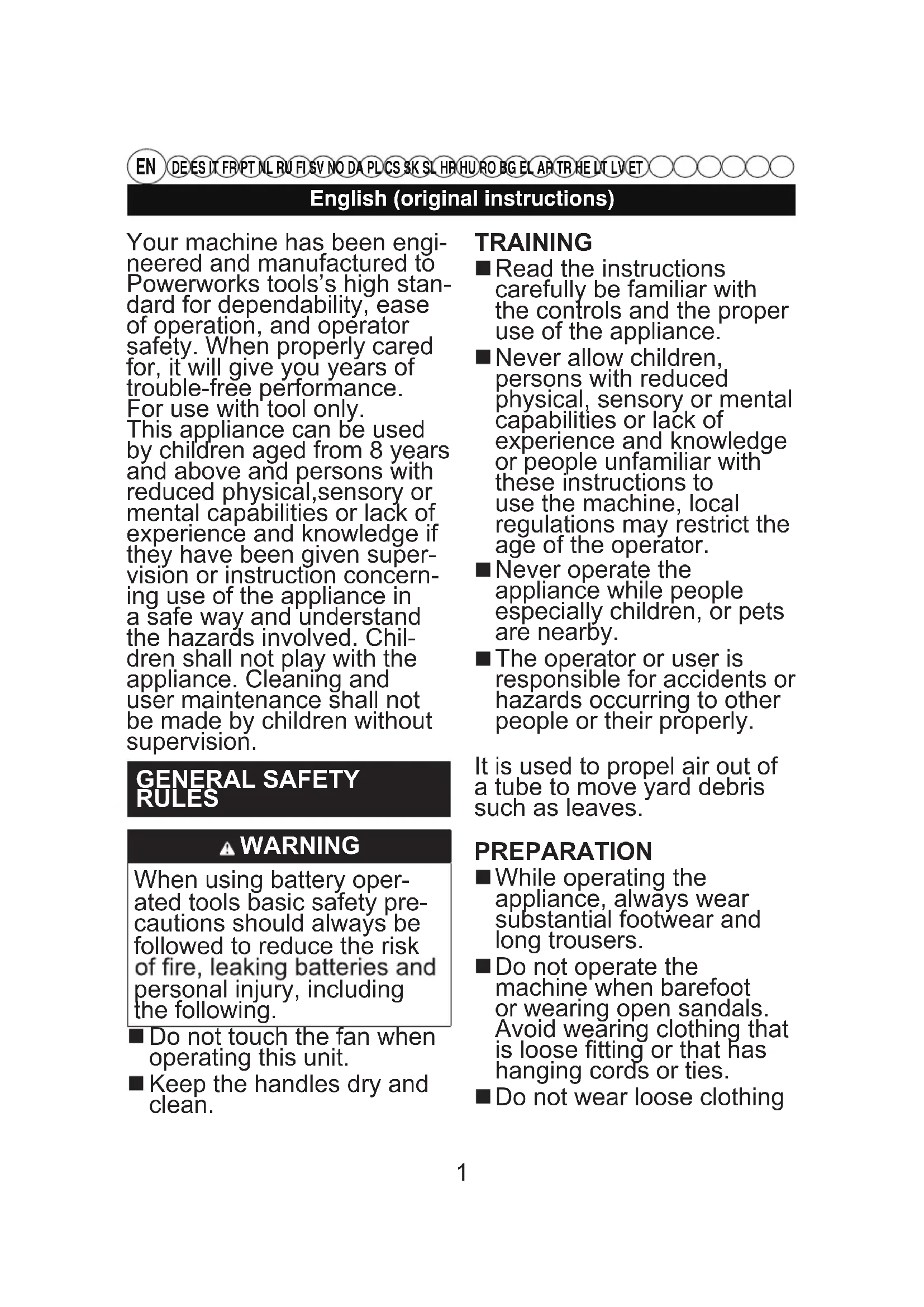 DE ES IT FR PT NL RU FI SV NO DA PL CS SK SL HR HU RO BG EL AR TR HE LT LV ET Your machine has been engi- neered and manufactured to Powerworks tools’s high stan- dard for dependability, ease of operation, and operator safety. When properly cared for, it will give you years of trouble-free performance. For use with tool only. This appliance can be used by children aged from 8 years and above and persons with reduced physical,sensory or mental capabilities or lack of experience and knowledge if they have been given super- vision or instruction concern- ing use of the appliance in a safe way and understand the hazards involved. Chil- dren shall not play with the appliance. Cleaning and user maintenance shall not be made by children without supervision. GENERAL SAFETY RULES WARNING When using battery oper- ated tools basic safety pre- cautions should always be followed to reduce the risk personal injury, including the following. Do not touch the fan when operating this unit. Keep the handles dry and clean. TRAINING Read the instructions carefully be familiar with the controls and the proper use of the appliance. Never allow children, persons with reduced physical, sensory or mental capabilities or lack of experience and knowledge or people unfamiliar with these instructions to use the machine, local regulations may restrict the age of the operator. Never operate the appliance while people especially children, or pets are nearby. The operator or user is responsible for accidents or hazards occurring to other people or their properly. It is used to propel air out of a tube to move yard debris such as leaves. PREPARATION While operating the appliance, always wear substantial footwear and long trousers. Do not operate the machine when barefoot or wearing open sandals. Avoid wearing clothing that is loose fitting or that has hanging cords or ties. Do not wear loose clothing 1English (original instructions)